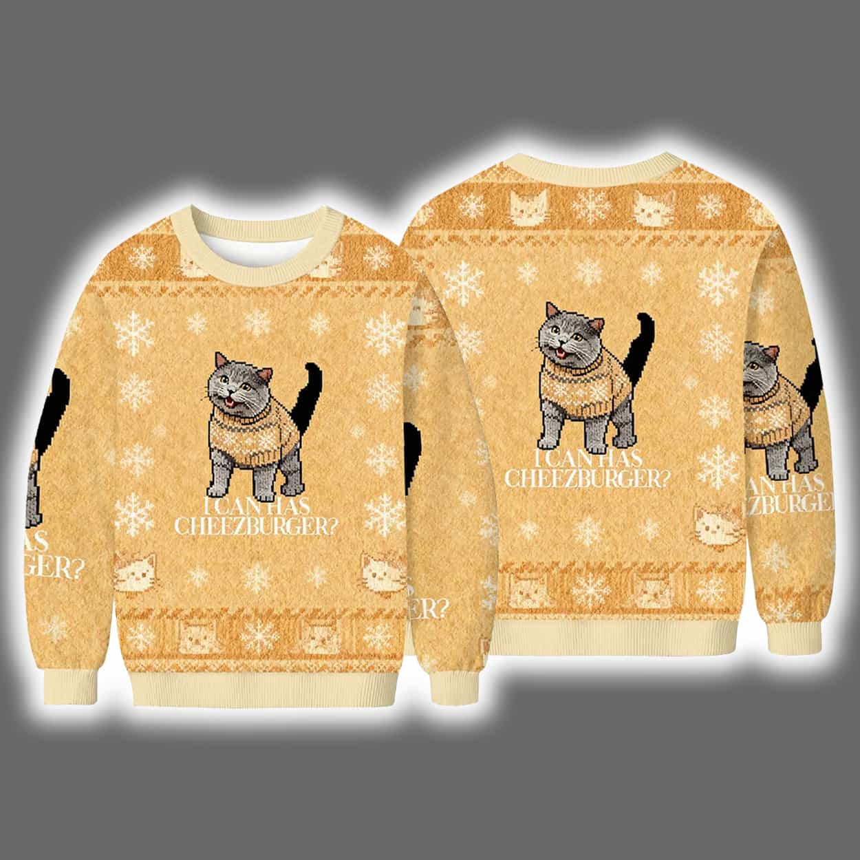 Ready to sleigh the season with style and sass? Snag your I Can Has Cheezburger Ugly Christmas Sweater today and let your inner meme master shine. Because nothing says holiday cheer like a cat demanding a cheeseburger!