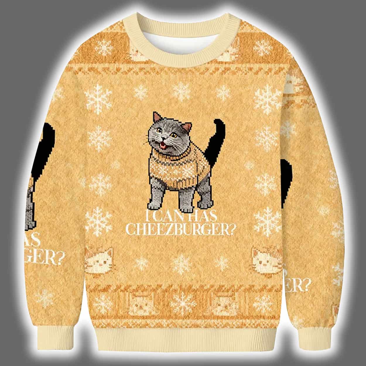 Bring meme magic to your holiday wardrobe with the I Can Has Cheezburger Ugly Christmas Sweater. Featuring a stylish cat and cheeky internet humor, it’s the purr-fect blend of festive fun and feline flair.