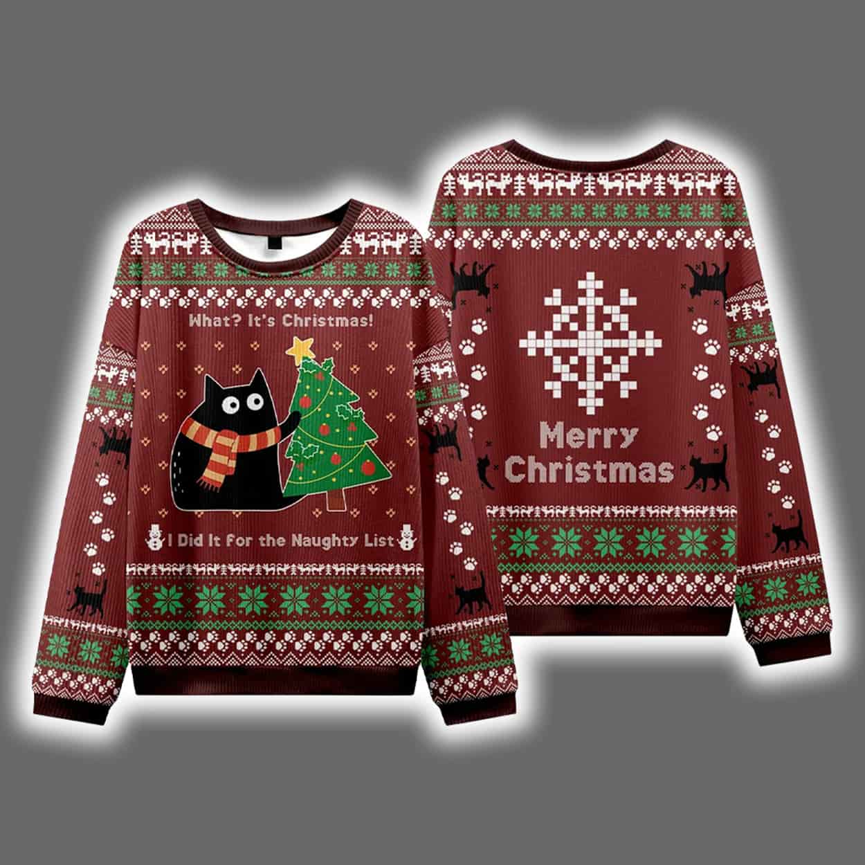 Unleash your inner mischief with the I Did It For The Naughty List Cat Ugly Christmas Sweater—a purr-fectly cheeky holiday must-have for feline fanatics and festive rebels.