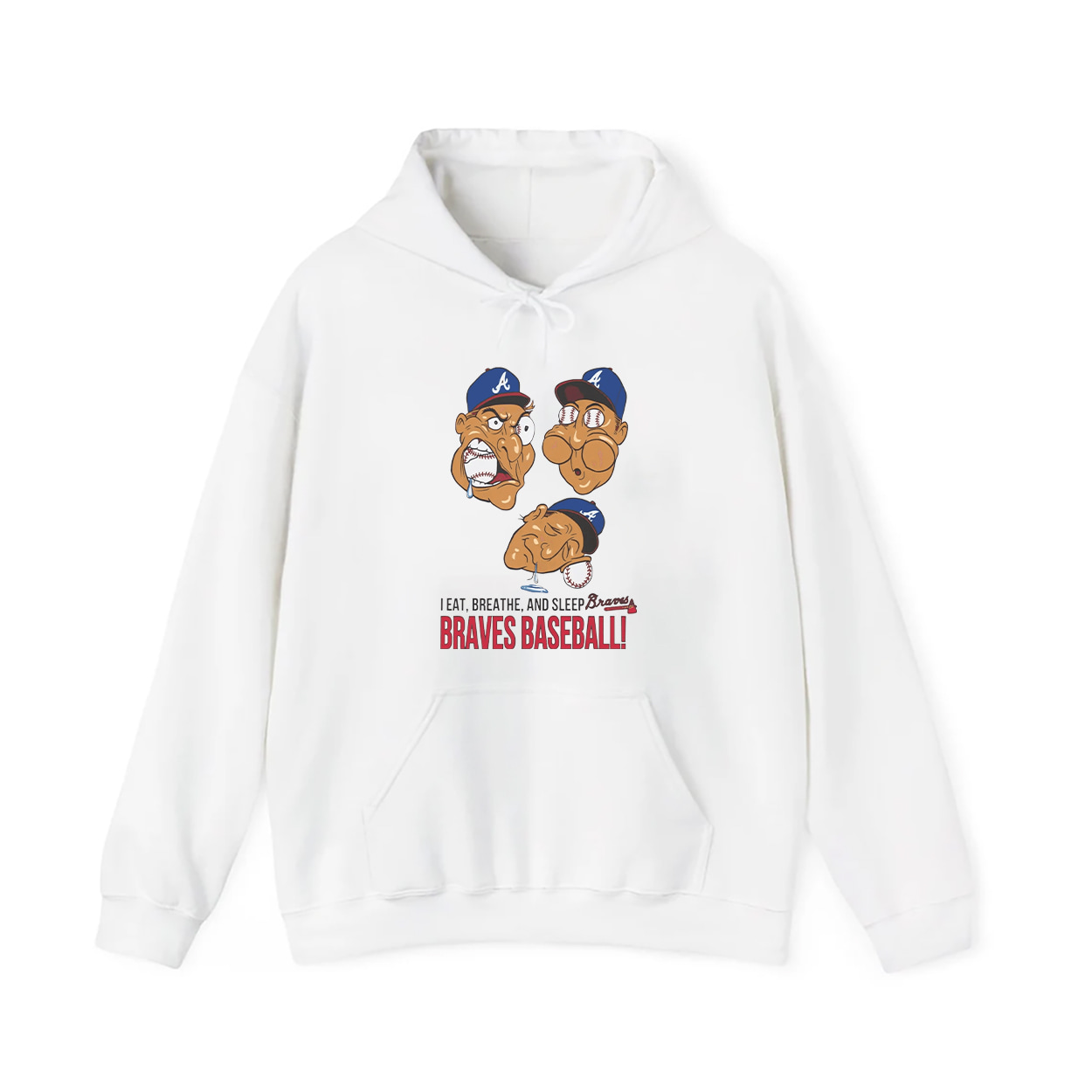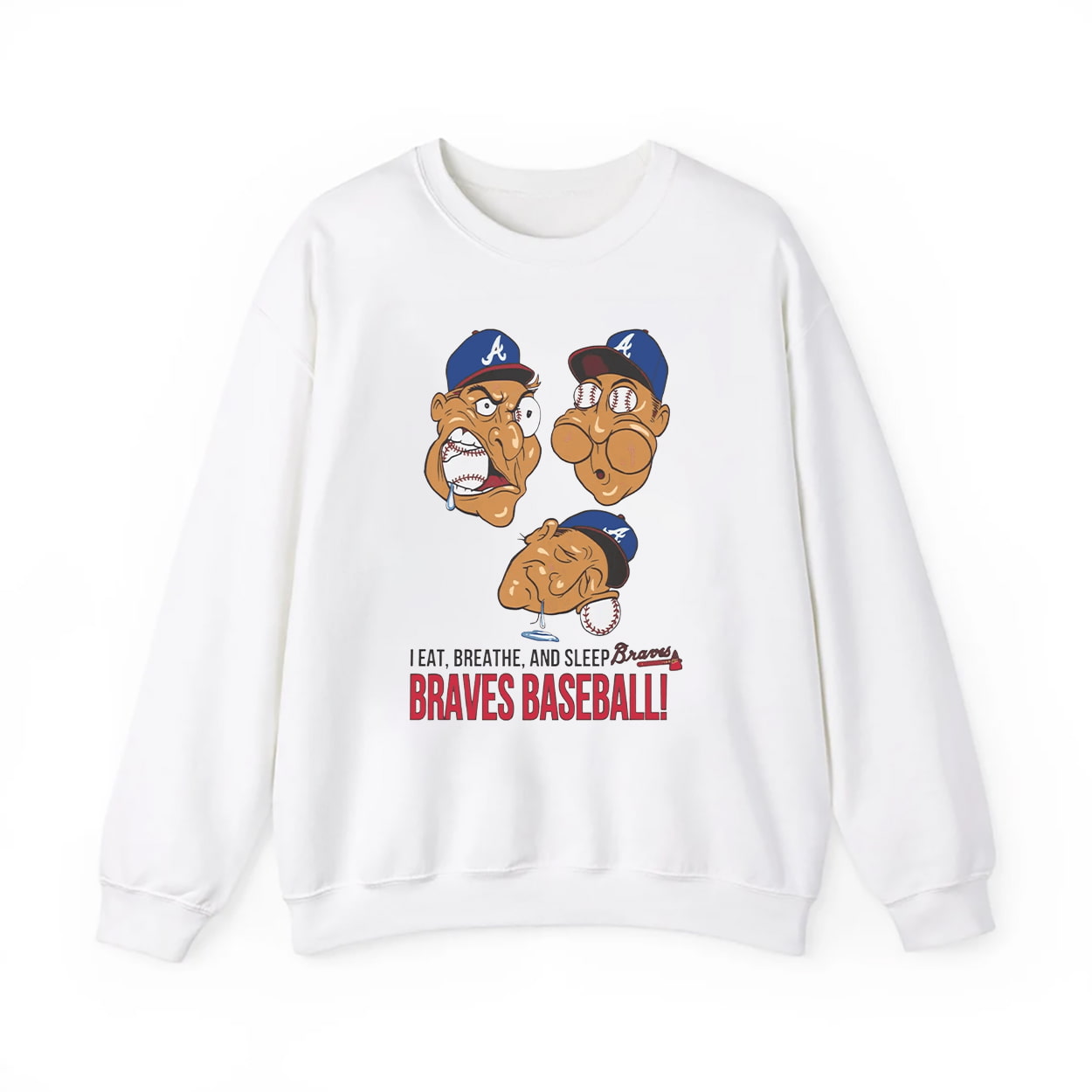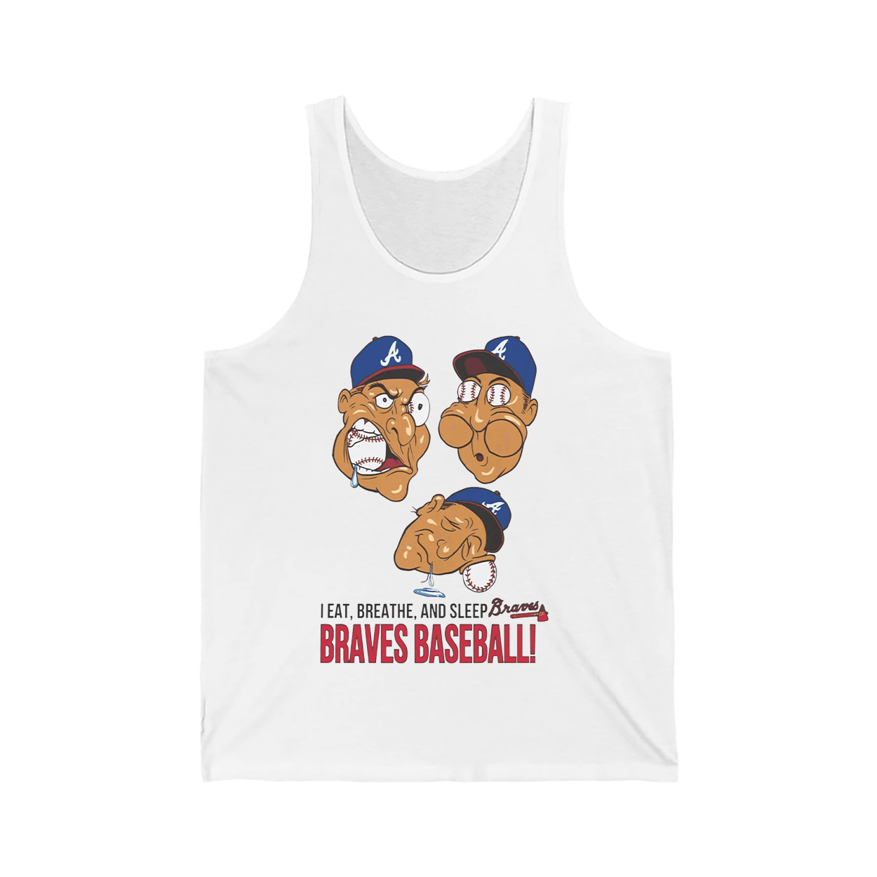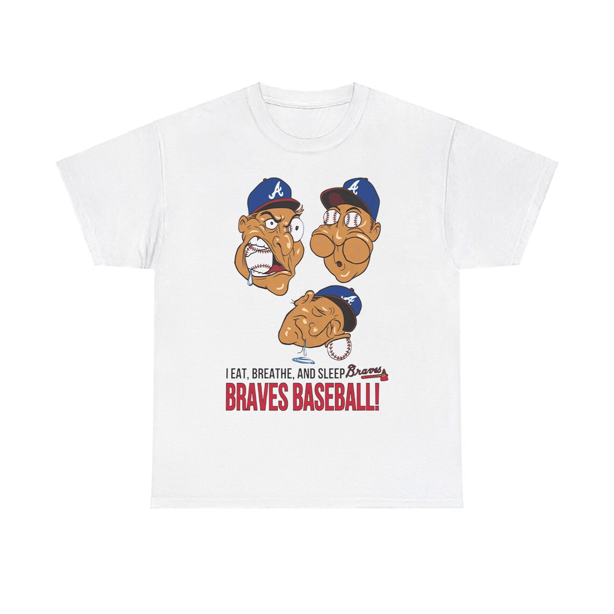This shirt is a full-throttle tribute to Atlanta Braves devotion. Front and center, three cartoon caricatures wear Braves caps with wild expressions that scream baseball fever. Below them, the bold slogan “I EAT, BREATHE, AND SLEEP Braves BRAVES BASEBALL!” pops with color and energy, leaving no doubt about where your priorities lie. This isn’t just a shirt—it’s a lifestyle announcement. Whether you’re watching the game, talking stats, or dreaming of walk-off homers, this tee lets everyone know: Braves baseball is your heartbeat.