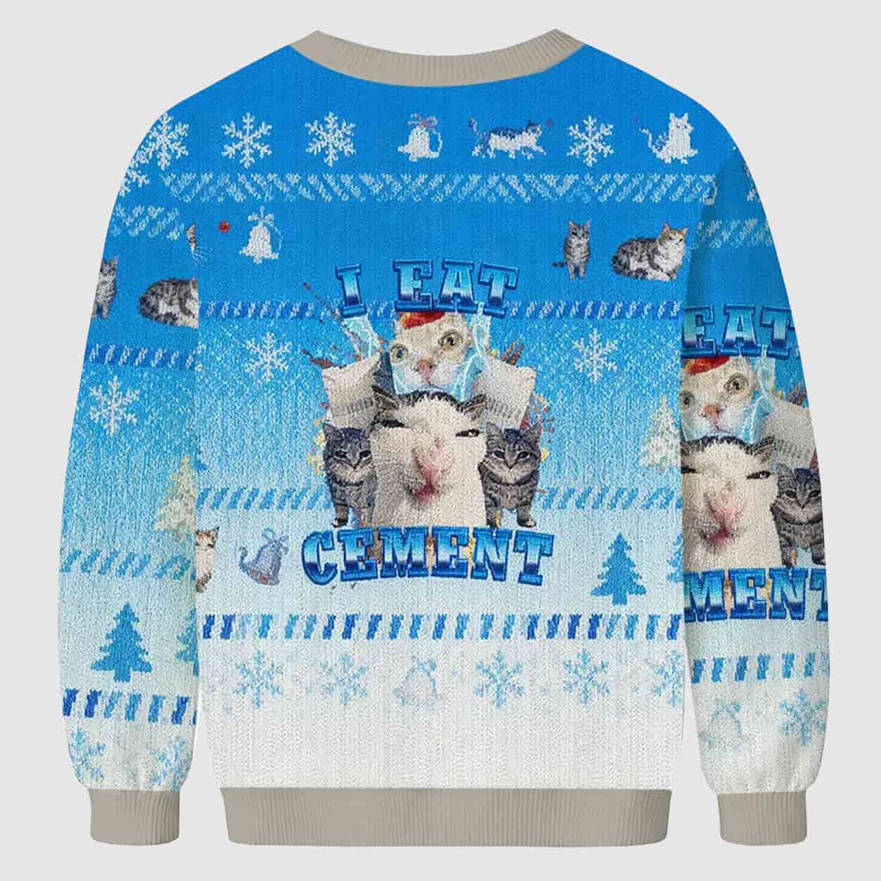 Decked out in cool blues and snowy whites, this sweater is the purr-fect blend of festive charm and internet humor. The front of the sweater hilariously displays a cat chomping down on what appears to be a block of cement, flanked by two serious-looking cat companions. The bold proclamation “I EAT” sits above, with “CEMENT” emblazoned below in icy blue lettering. The backdrop is a winter wonderland of snowflakes, Christmas trees, curious cats, and snowmen, creating a chilly cheer that extends all around the sweater.