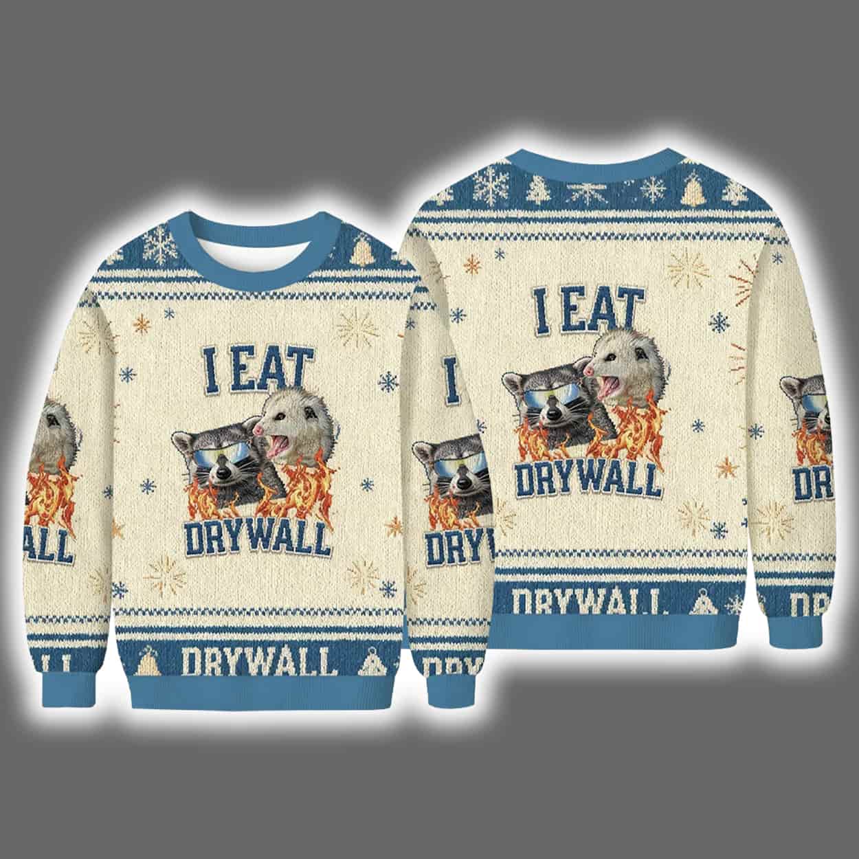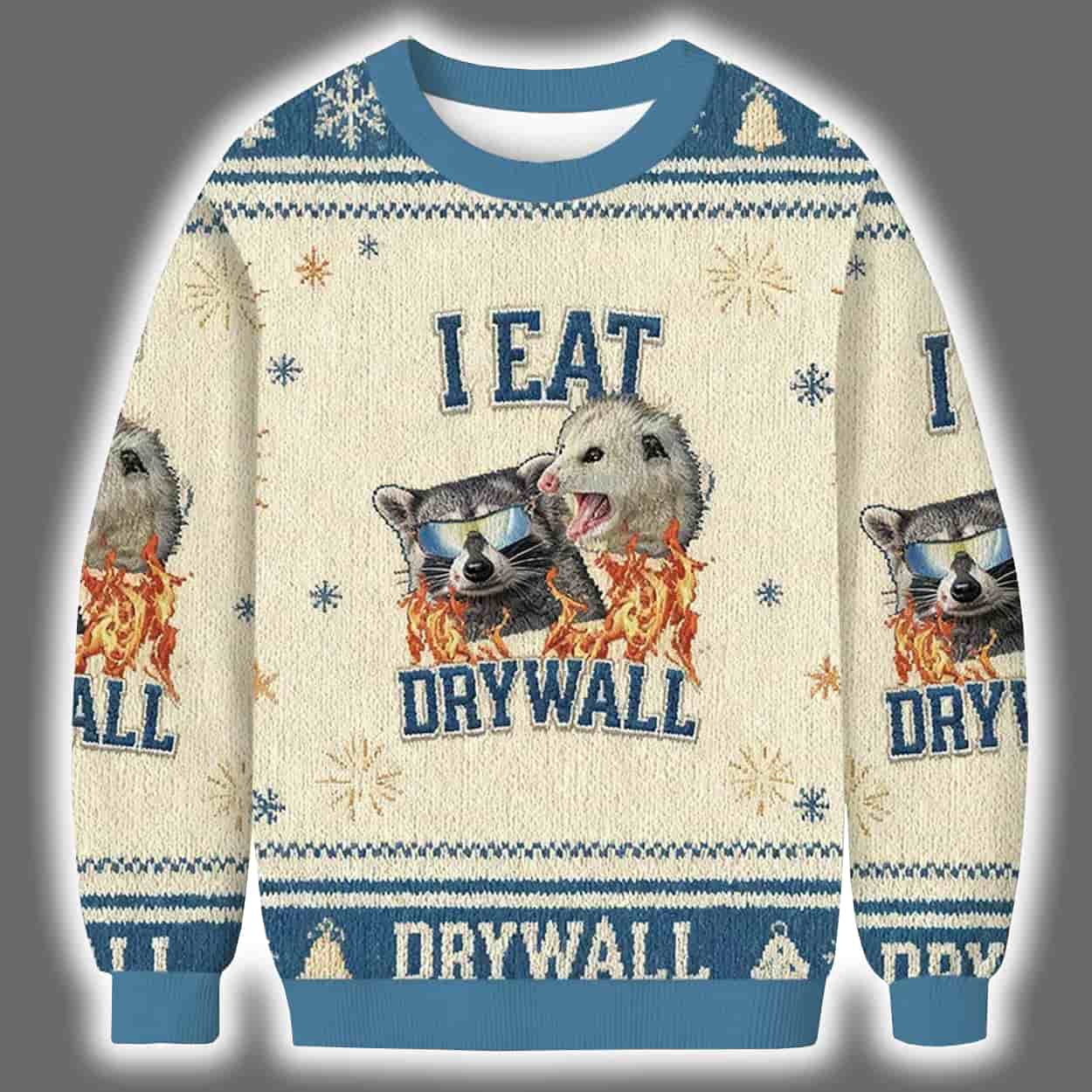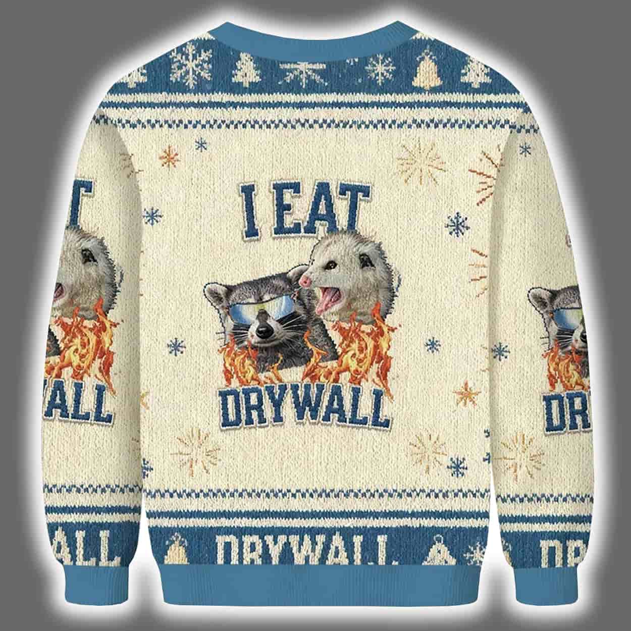 Deck the halls with absurdity and let your wardrobe do the talking! This sweater is a riotous blend of festive charm and offbeat humor. Cream-colored with bold blue accents, it features a repeating pattern of two mischievous raccoons—one of which is dramatically chomping on drywall, flames flaring around its mouth. Snowflakes and geometric shapes add a seasonal touch, while the bold, unapologetic text “I EAT DRYWALL” screams across the front and back in all caps.