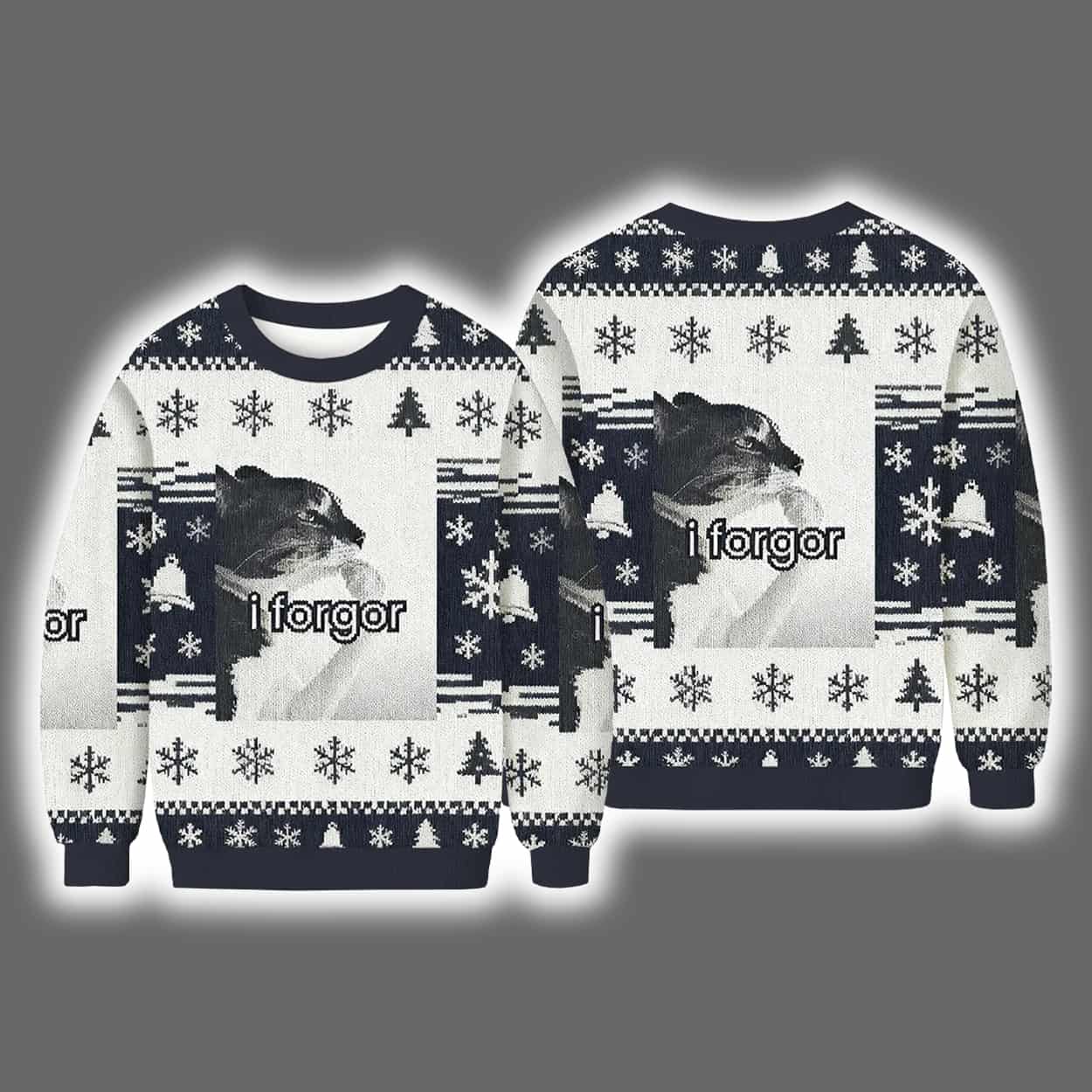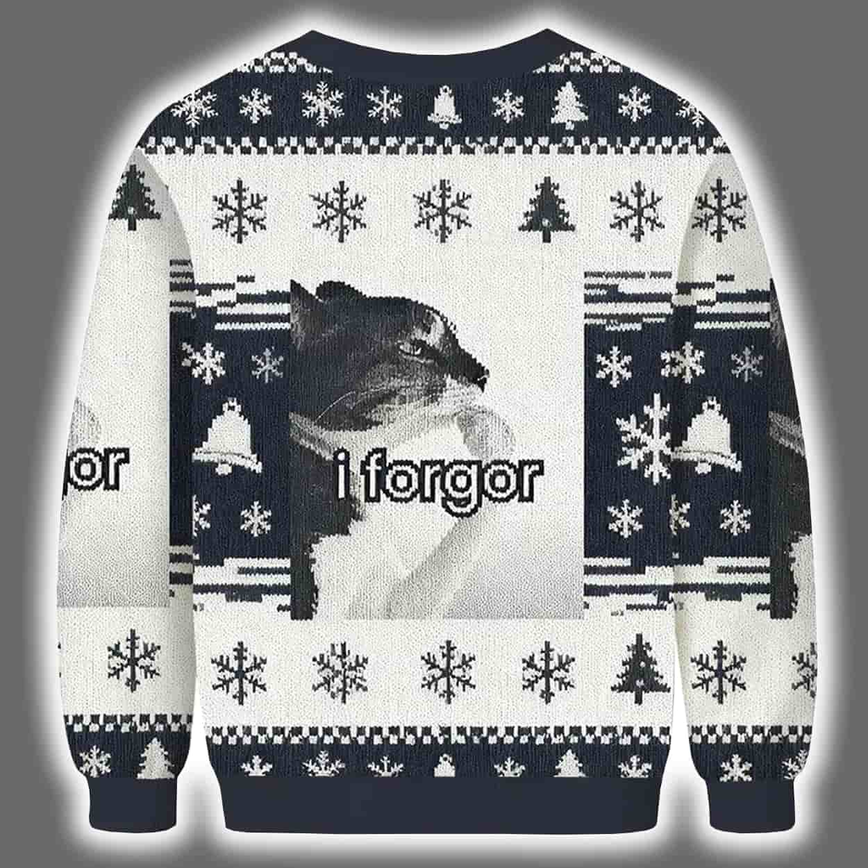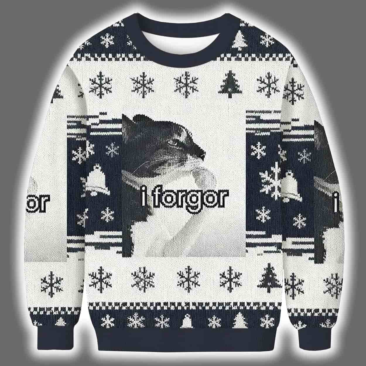 Deck the halls with laughter in this sweater. This eye-catching piece features a dazed-looking black cat front and center, paired with the iconic internet slang “i forgor” — a delightfully misspelled phrase that captures the spirit of forgetfulness with comic charm. Wrapped in a classic holiday pattern of snowflakes, reindeer, and Christmas trees in crisp navy and white, this sweater delivers cozy vibes with a side of absurdity. It’s festive, it’s funny, and it’s guaranteed to be the most talked-about outfit at any holiday gathering.