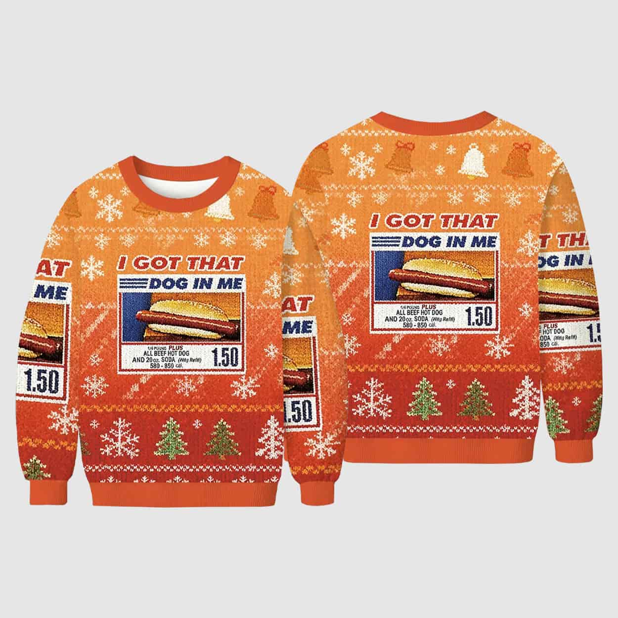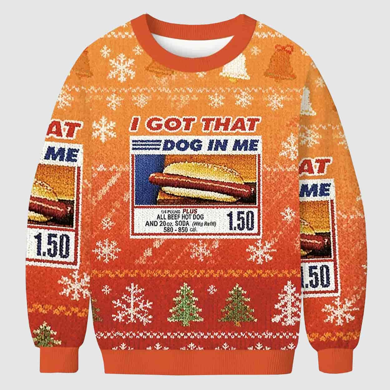 Get ready to turn heads and spark laughs with this sweater. This vibrant orange holiday piece features a central graphic of a juicy hot dog, complete with mustard and relish, proudly labeled “100% BEEF HOT DOG.” Above the image, the phrase “I GOT THAT DOG IN ME” shouts your seasonal confidence, while a mock nutritional label adds a cheeky twist with a price tag of “1.50.” Surrounding the centerpiece are classic festive icons — snowflakes, Christmas trees, and gingerbread men — blending traditional holiday charm with meme-worthy bravado. The design repeats on both front and back, making sure your hot dog spirit is seen from every angle.