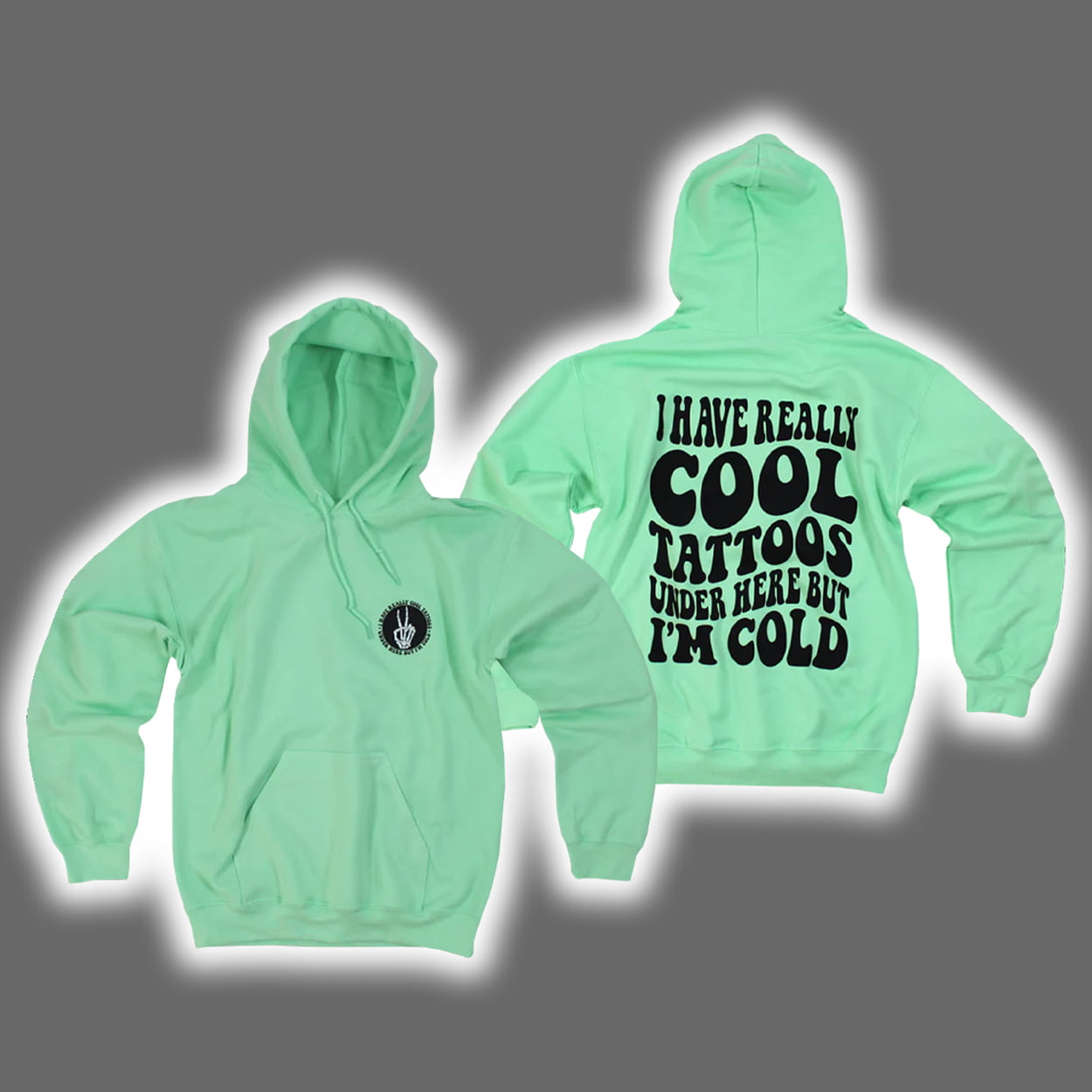 Stay cozy while making a bold statement with the I Have Really Cool Tattoos Under Here But I’m Cold Hoodie. A playful blend of humor and personality, this mint green essential is perfect for those who love to express themselves—even when bundled up.