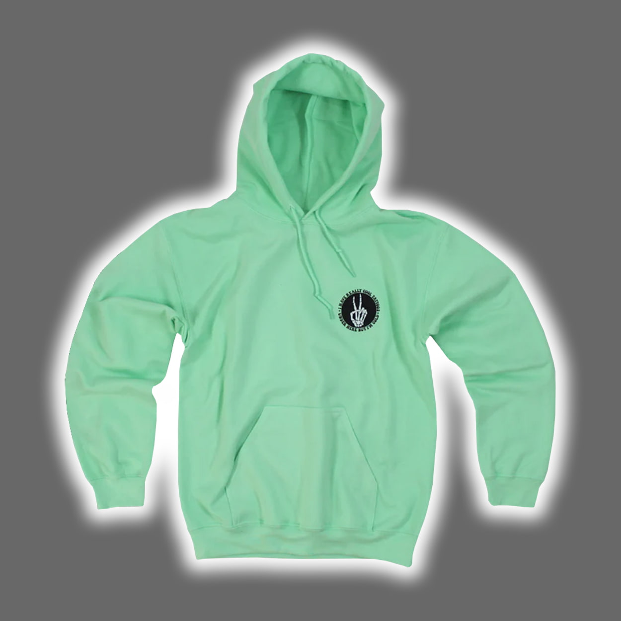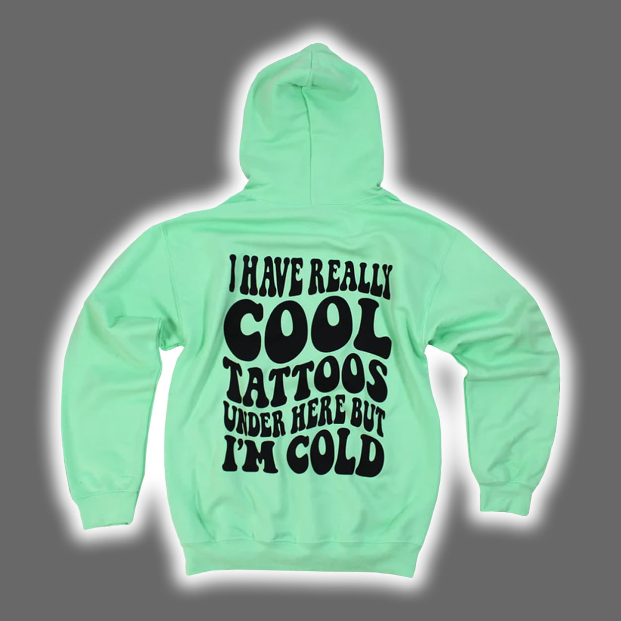 This hoodie is more than just a layer—it’s a conversation starter. On the front, a subtle black emblem featuring a white hand graphic adds a touch of intrigue. But the real showstopper is on the back: bold black lettering that reads, “I HAVE REALLY COOL TATTOOS UNDER HERE BUT I’M COLD.” Whether you’re inked or just love the vibe, this hoodie delivers warmth with a wink.