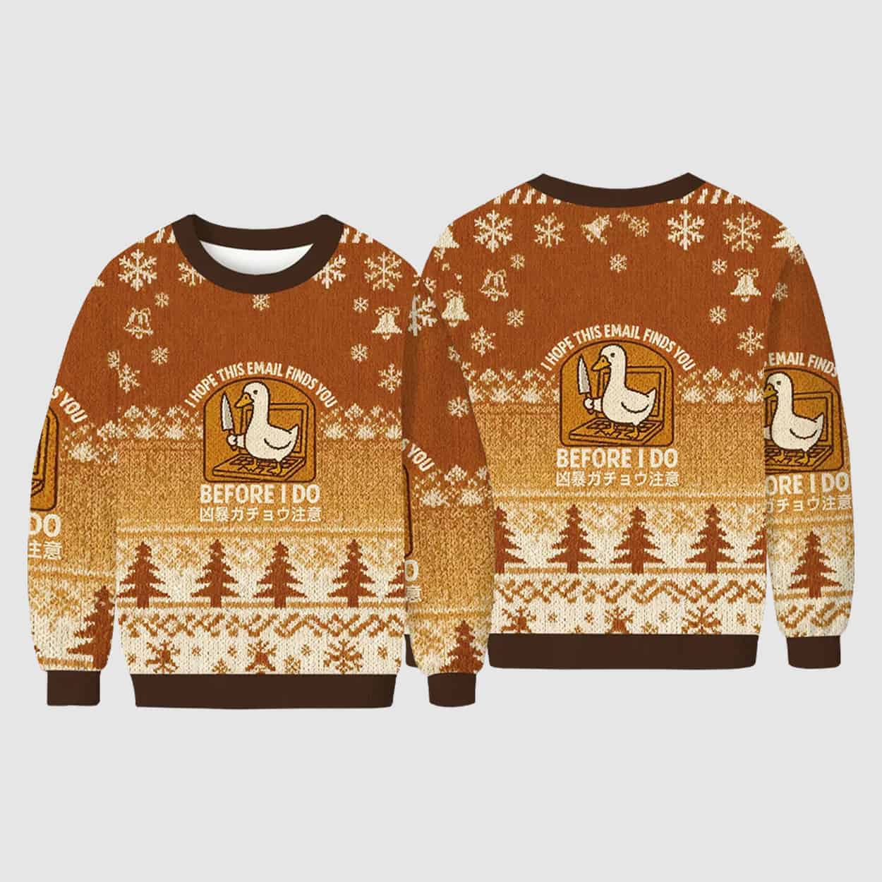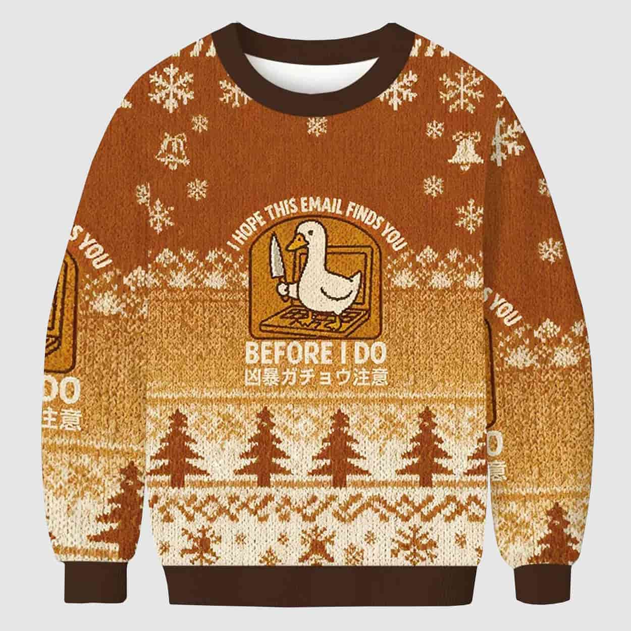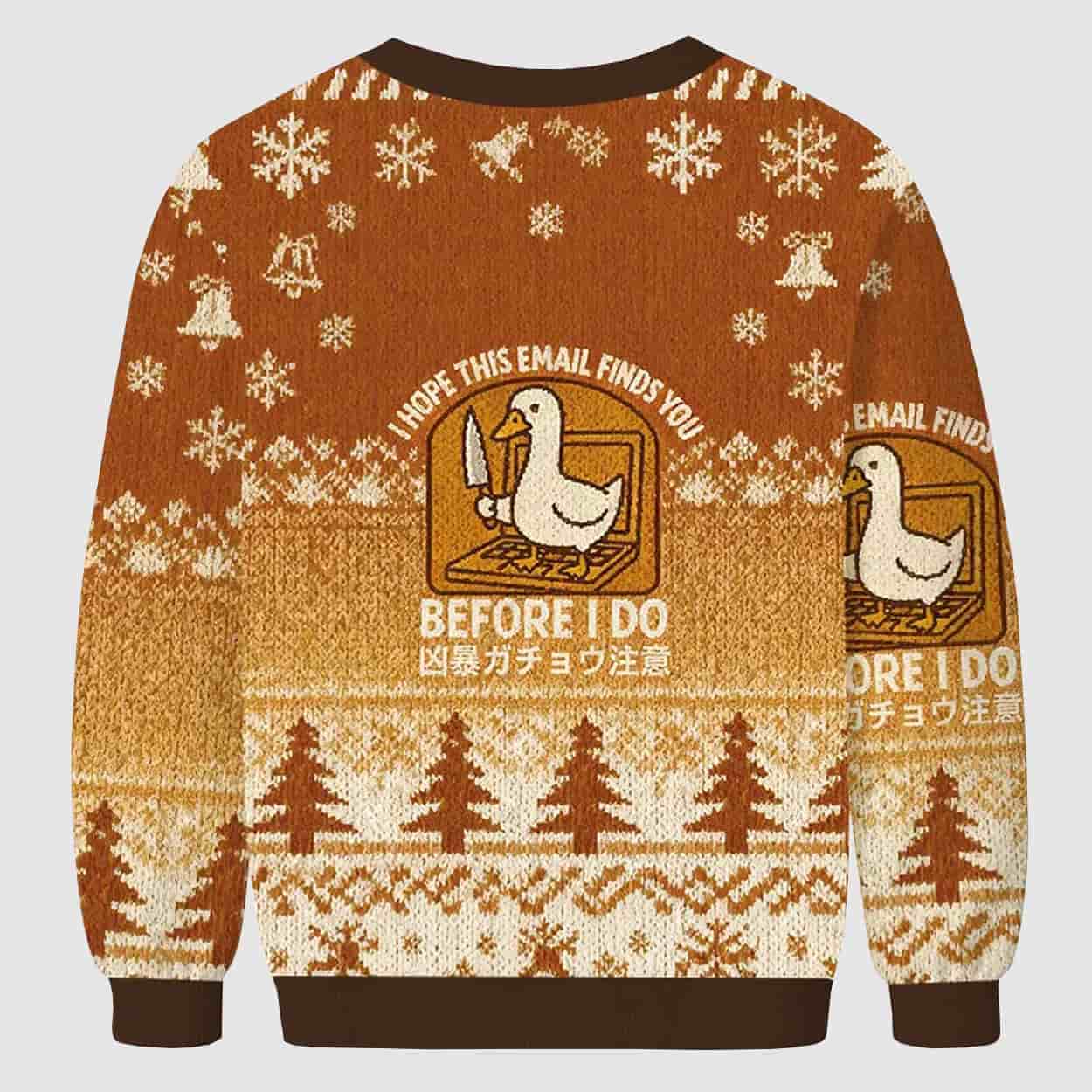 Make spirits bright—and slightly chaotic—with the I Hope This Email Finds You Before I Do Ugly Christmas Sweater, a festive tribute to goose-fueled mayhem and meme culture.