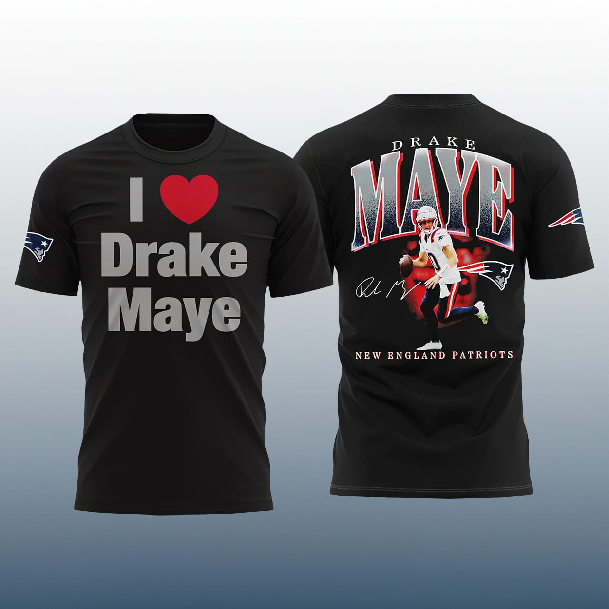 This shirt is a fan-favorite fusion of admiration and athleticism. On the front, the phrase “I ❤️ Drake Maye” pops in bold white text, with a pixelated red heart that adds a retro twist. The left sleeve features the unmistakable New England Patriots logo, anchoring your devotion in team tradition. Flip to the back and it’s game time: a dynamic image of Drake Maye mid-play, his printed signature adding a personal touch, and “DRAKE MAYE” emblazoned above in commanding font. At the bottom, “PATRIOTS” reminds everyone exactly where your loyalty lies. The right sleeve completes the look with another Patriots logo—because one just isn’t enough.
