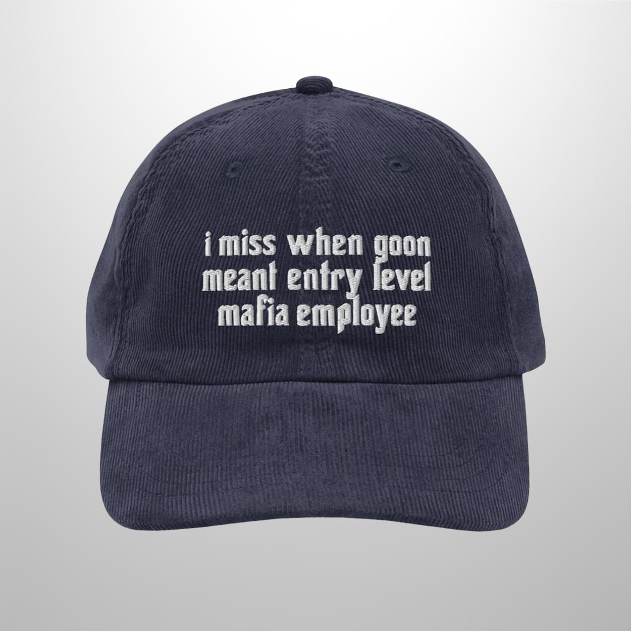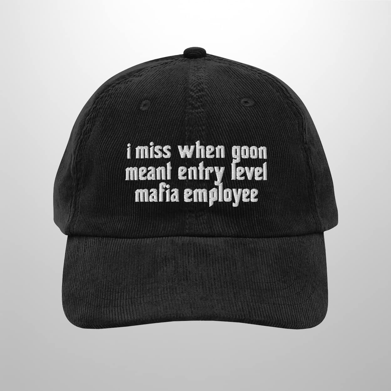 Ready to add some edge to your wardrobe? The I Miss When Goon Meant Entry Level Mafia Employee Corduroy Hat is your ticket to standing out with style and smarts. Grab yours now and let your headwear do the talking.