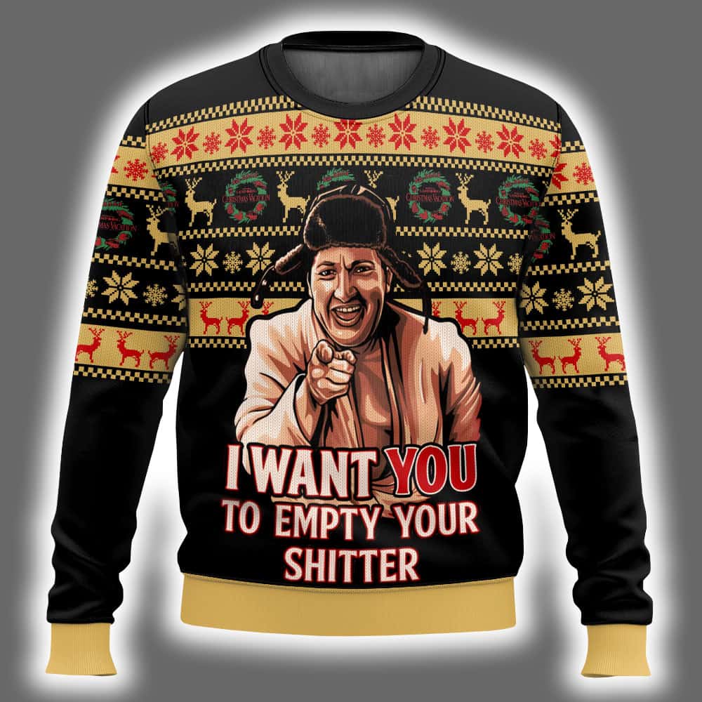 Get ready to be the life of the party—or the reason for a double take—with the I Want You National Lampoon’s Vacation Ugly Christmas Sweater. This hilariously bold design features a graphic of Cousin Eddie pointing forward, echoing the iconic Uncle Sam pose, but with a twist that only Vacation fans will truly appreciate. Beneath the image, the sweater proudly declares: “I WANT YOU TO EMPTY YOUR SHITTER” in bold red and white lettering. Traditional holiday motifs like snowflakes, reindeer, and geometric patterns in red, yellow, and black add a festive contrast to the crude humor, making this sweater a perfect blend of holiday spirit and cinematic absurdity.