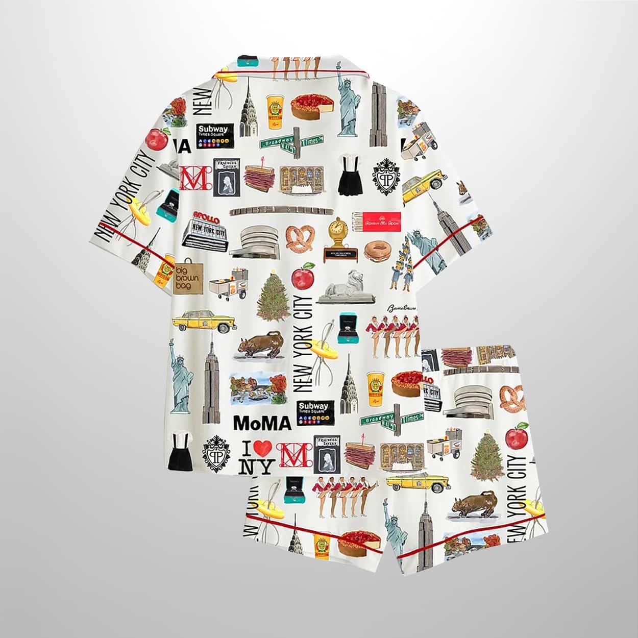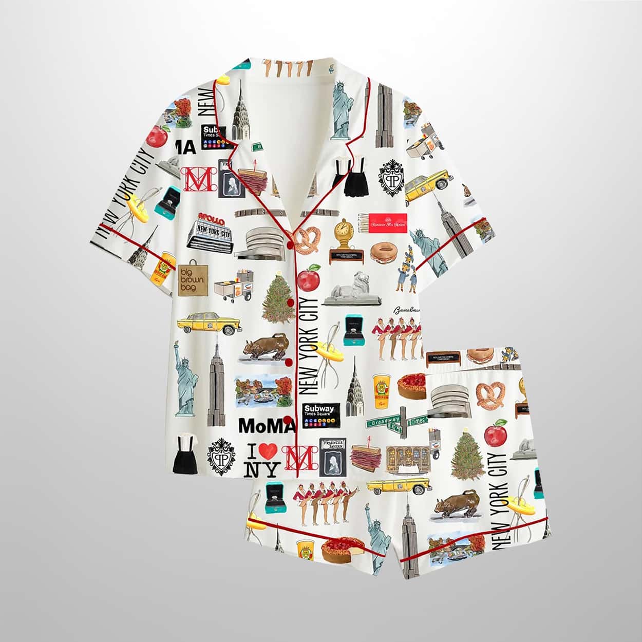 Bring the energy of New York City to your holiday nights with this pajama set. This short-sleeved button-up shirt and matching shorts are bursting with vibrant illustrations of the city’s most beloved symbols—Statue of Liberty, Empire State Building, yellow taxis, hot dogs, pretzels, pizza slices, and Broadway signs. Snowflakes sprinkle the design with festive flair, while red piping along the collar and hems adds a classic holiday touch. It’s a wearable tribute to the city that never sleeps, perfect for lounging in style or gifting with heart.