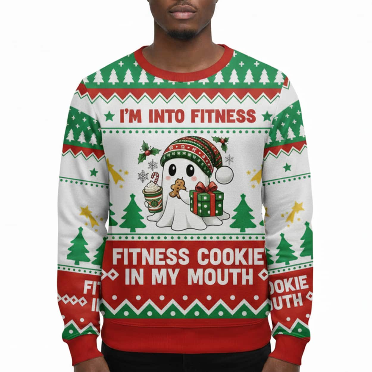 Get ready to sleigh the holiday party with this sweater. This festive gem features a cartoon ghost front and center, rocking a Santa hat and clutching a gingerbread cookie and a wrapped gift with unapologetic joy. Surrounding the ghost are classic holiday icons—candy canes, snowflakes, and a steaming mug of cheer—all woven into a vibrant pattern of red, green, and white. The punchline? A cheeky twist on fitness culture: “I’M INTO FITNESS / FITNESS COOKIE IN MY MOUTH.” It’s the perfect blend of holiday spirit and snack-fueled sass.