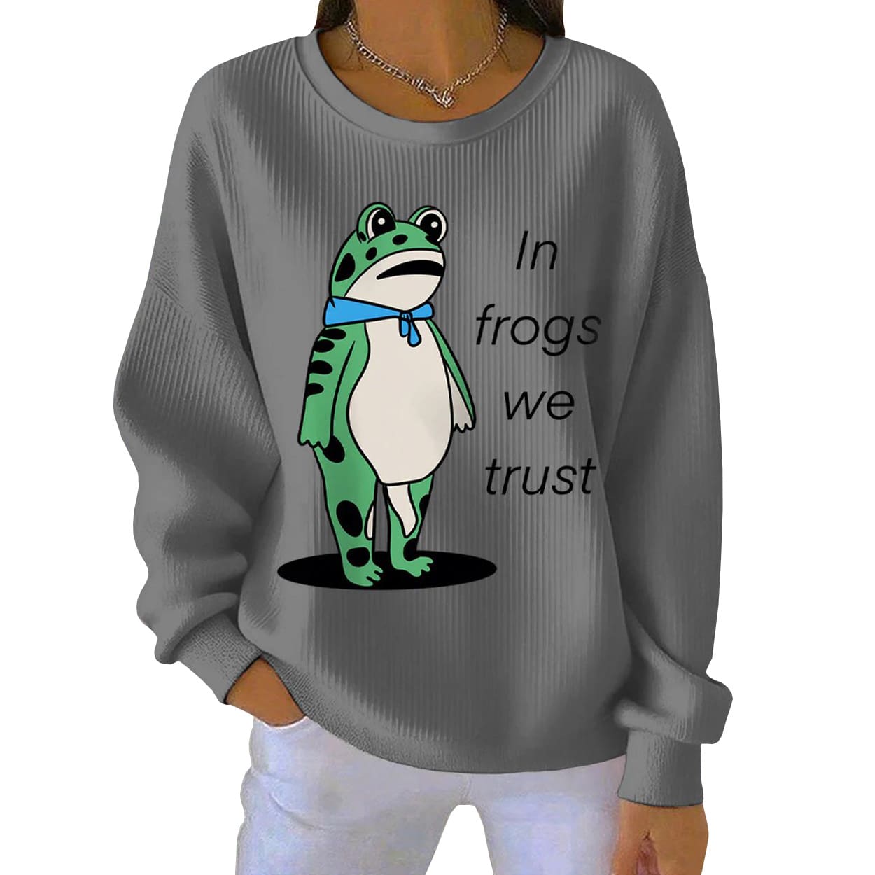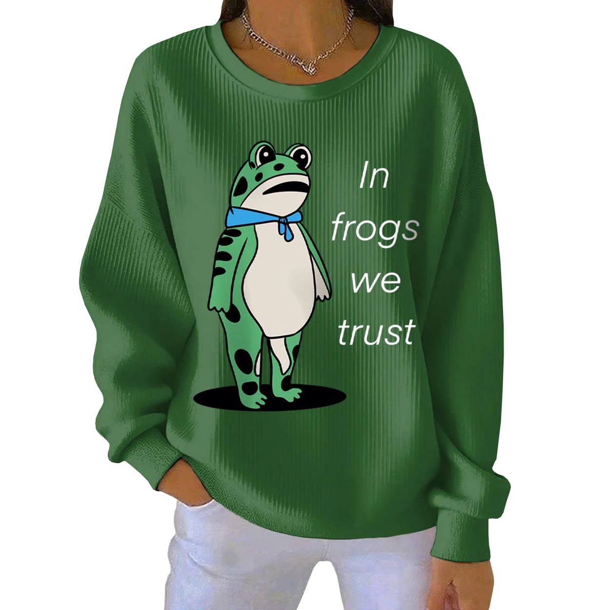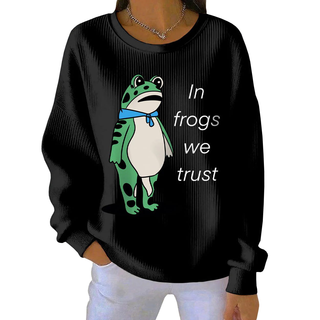 Add a splash of playful charm to your wardrobe with this sweatshirt. This eye-catching piece features a cartoon frog standing tall with a white belly, black spots, and a cozy blue scarf—ready to face the world with amphibian confidence. Beside the frog, the phrase “In frogs we trust” is printed in bold, cheeky lettering, offering a humorous twist on a classic motto. The ribbed texture and round neckline give it a relaxed, stylish silhouette that’s perfect for casual outings or cozy days indoors.