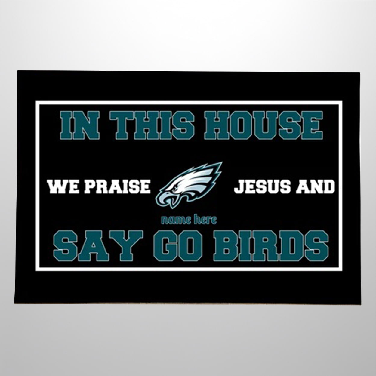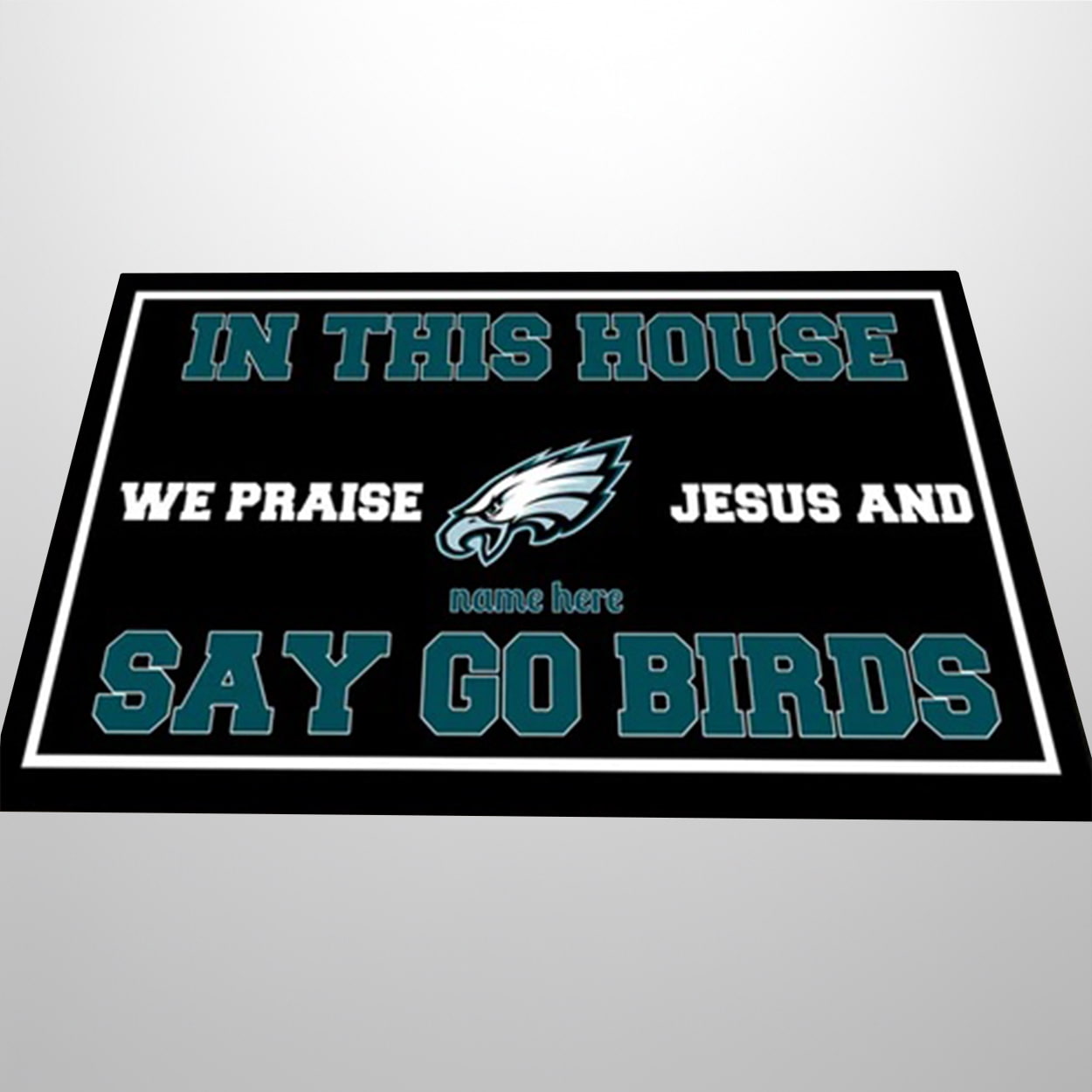 Why settle for ordinary when your doorway can preach and cheer? Customize your In This House We Praise Jesus And Say Go Birds Doormat today and let every step into your home feel like a touchdown.