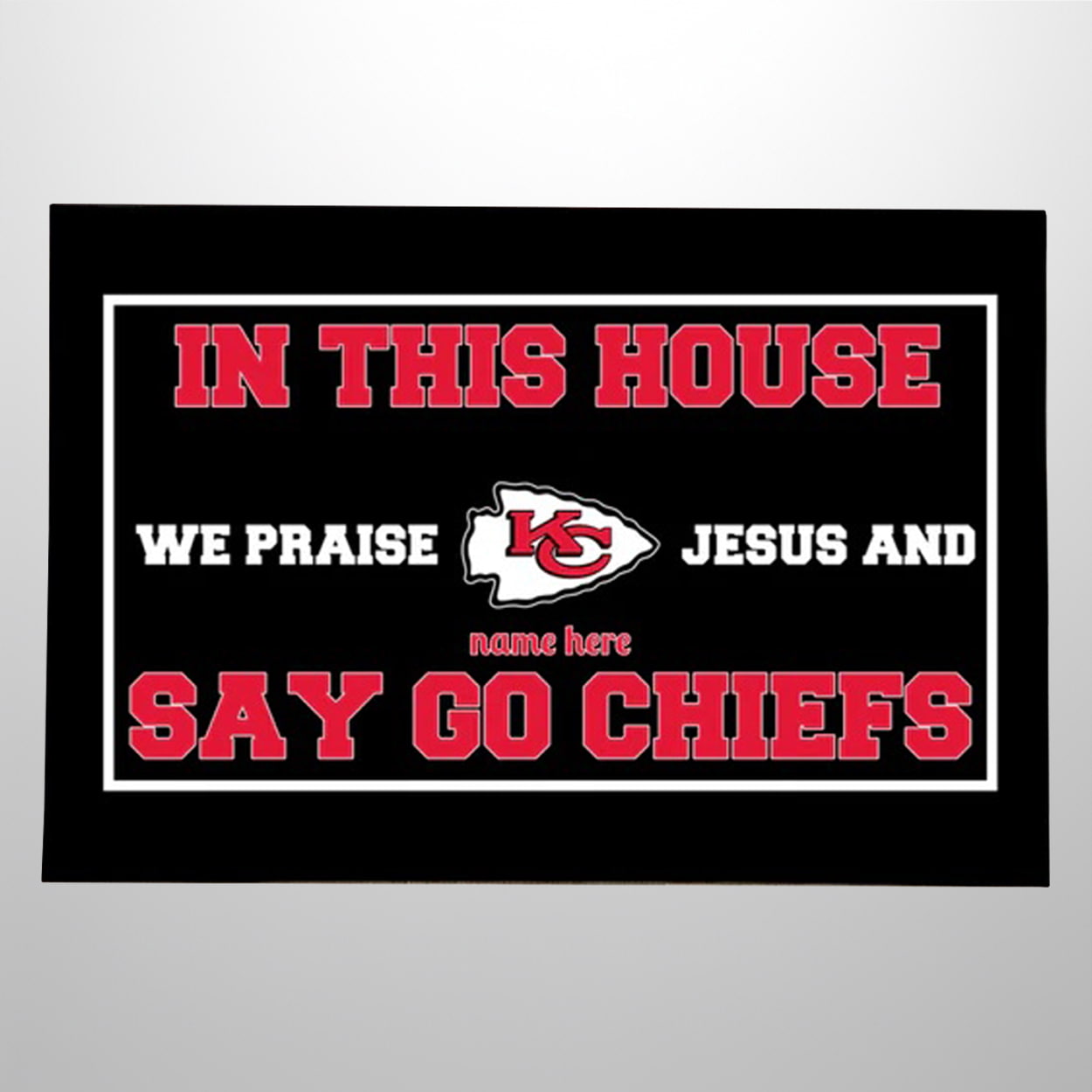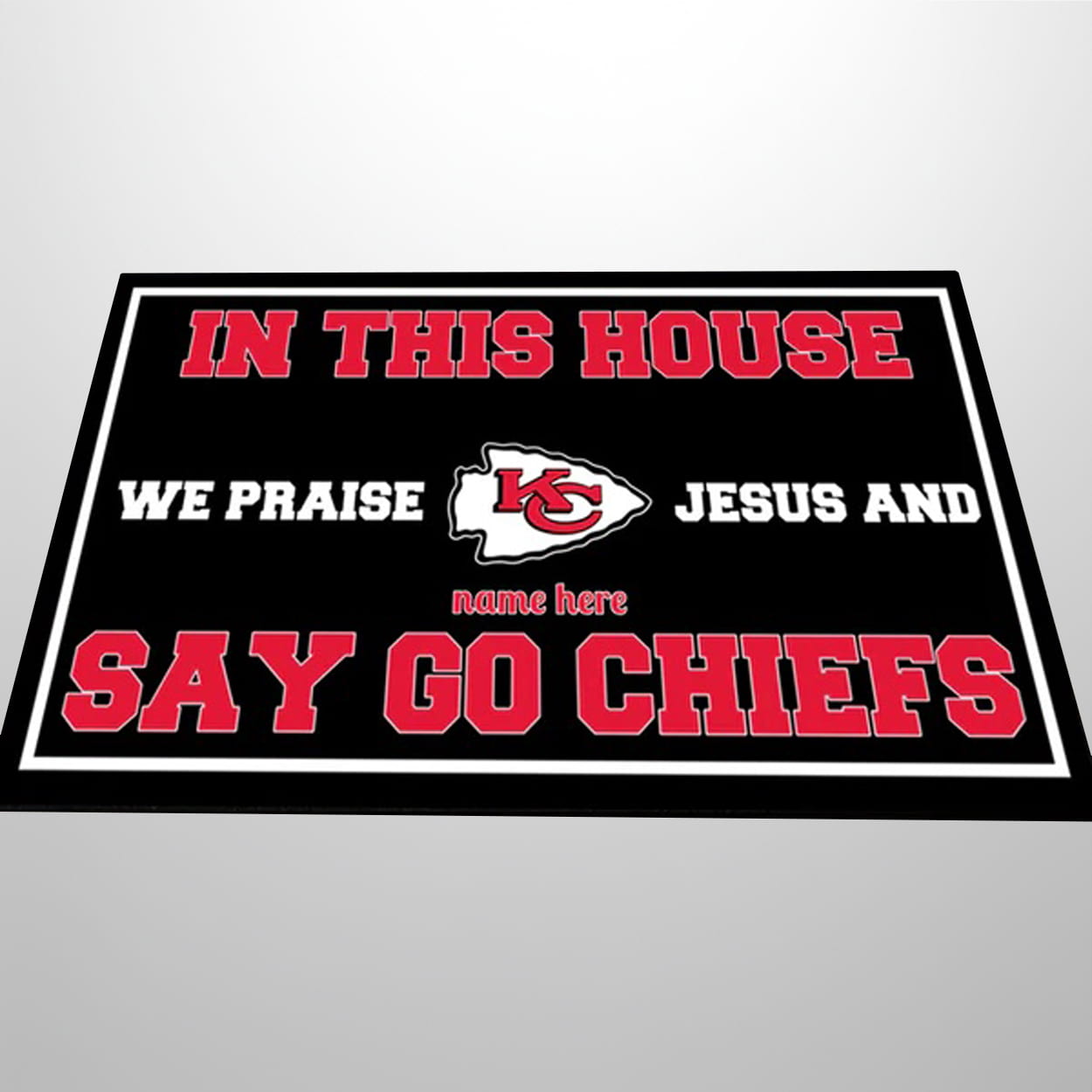 Make a bold entrance with the In This House We Praise Jesus And Say Go Chiefs Doormat—a spirited blend of faith and football fandom.