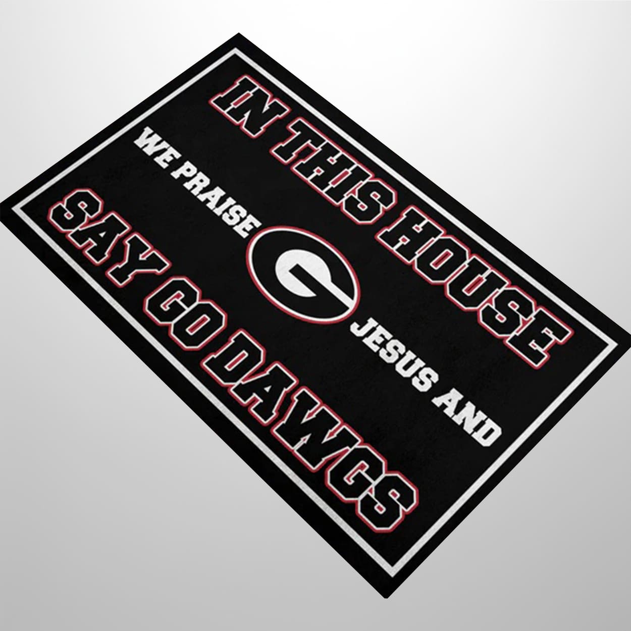 Make a bold statement at your doorstep with the In This House We Praise Jesus And Say Go Dawgs Doormat—where faith meets fierce fandom in one unforgettable design.
