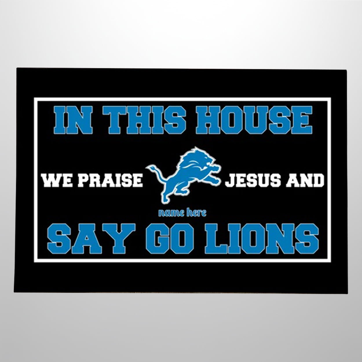 Welcome guests with faith and football flair—this In This House We Praise Jesus And Say Go Lions Doormat blends spiritual pride with team spirit in one bold statement.