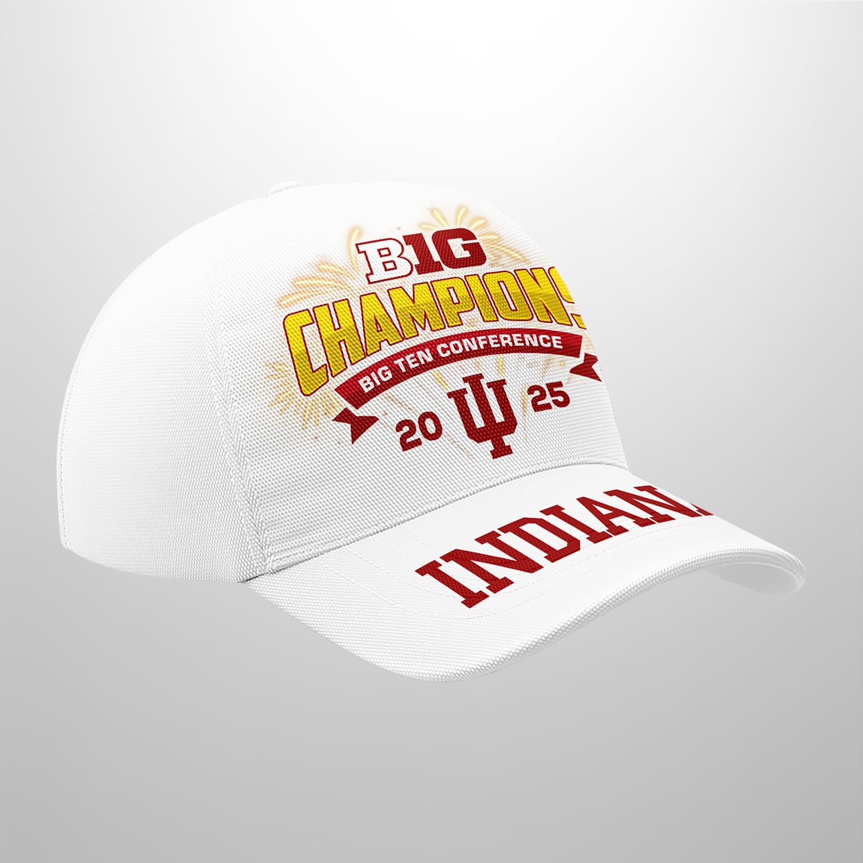 Put your pride on display with this hat—a head-turning tribute to a season of dominance. This cap features “BIG CHAMPIONS” in bold, explosive lettering across the front, backed by a celebratory burst graphic that screams victory. Just below, “BIG TEN CONFERENCE” anchors the design, flanked by the year “2025” split on either side of the iconic Indiana University logo. The brim seals the deal with “INDIANA” printed loud and proud in crisp white, making it clear who rules the gridiron.