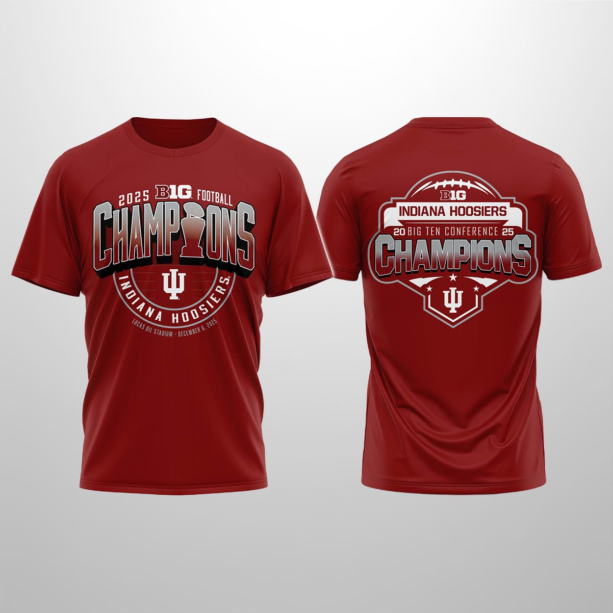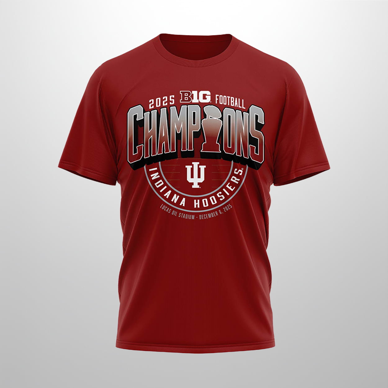 The Hoosiers have claimed the crown, and now you can wear the moment. This shirt is a bold, celebratory piece that captures the energy of victory. On the front, powerful text reads “2025 BIG Football CHAMPIONS INDIANA HOOSIERS,” with a trophy silhouette and the Indiana University logo anchoring the design. Below it all, the date and location—“LUCAS OIL STADIUM – DECEMBER 6, 2025”—mark the battlefield where glory was earned. The back continues the celebration with a football-themed graphic and the triumphant phrase “BIG INDIANA HOOSIERS 20 BIG TEN CONFERENCE 25 CHAMPIONS,” framed by another proud IU logo.