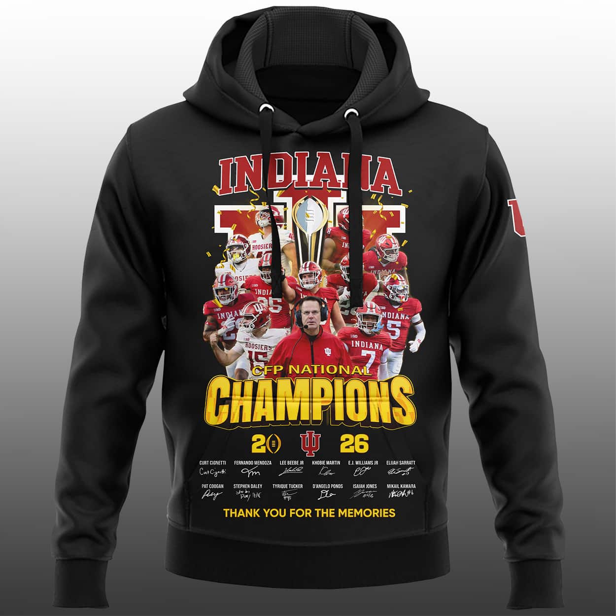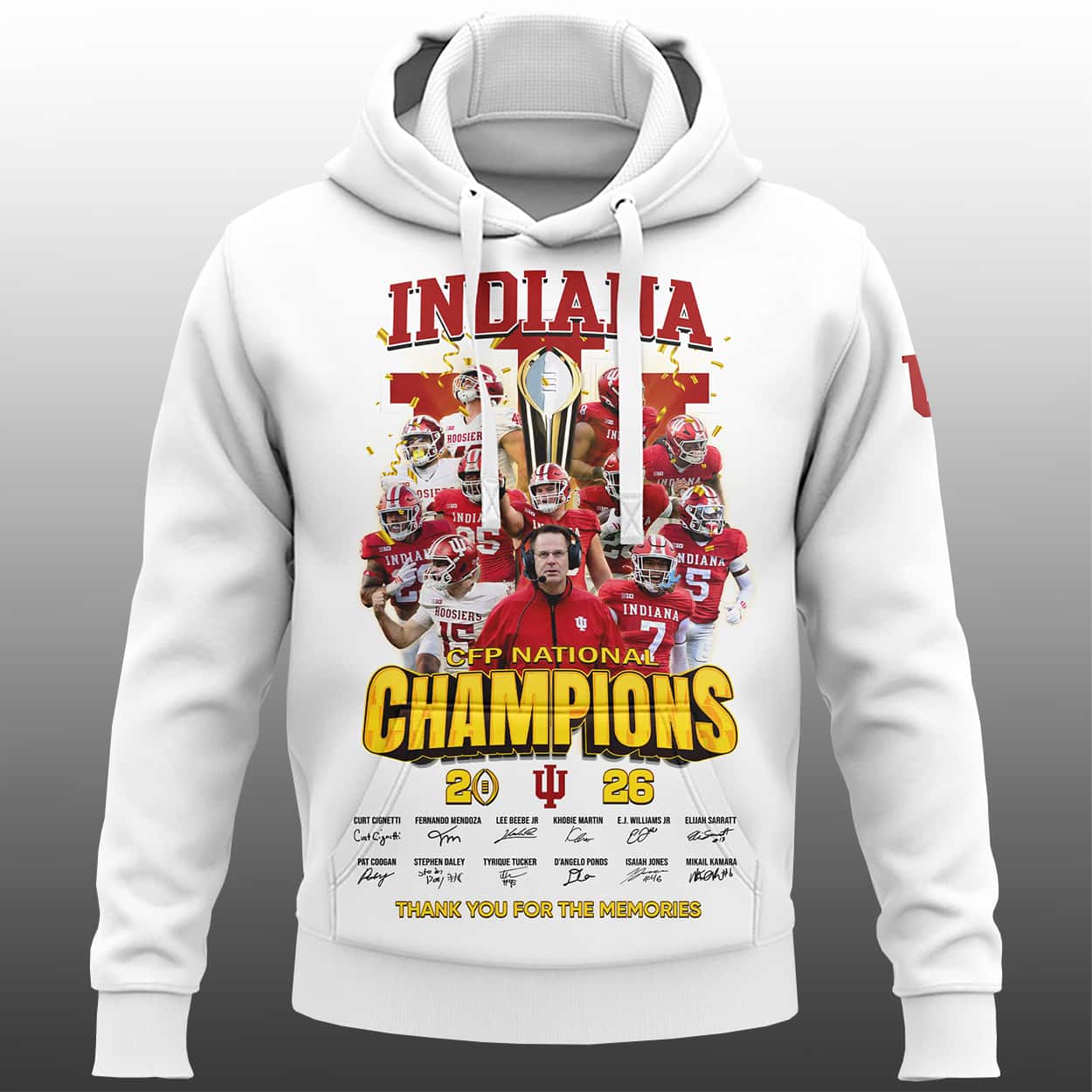 Wrap yourself in victory with this hoodie—a fiery red masterpiece that honors the Hoosiers’ rise to the top. The front proudly displays “INDIANA” above the bold yellow proclamation “CFP NATIONAL CHAMPIONS,” setting the tone for celebration. A dynamic collage of football players in action surrounds a gleaming trophy, capturing the energy of the championship run. The year “2026” stand out as milestones of dominance, flanking the Indiana University logo. At the bottom, the heartfelt phrase “THANK YOU FOR THE MEMORIES” ties it all together, making this hoodie a wearable tribute to a legacy of excellence.
