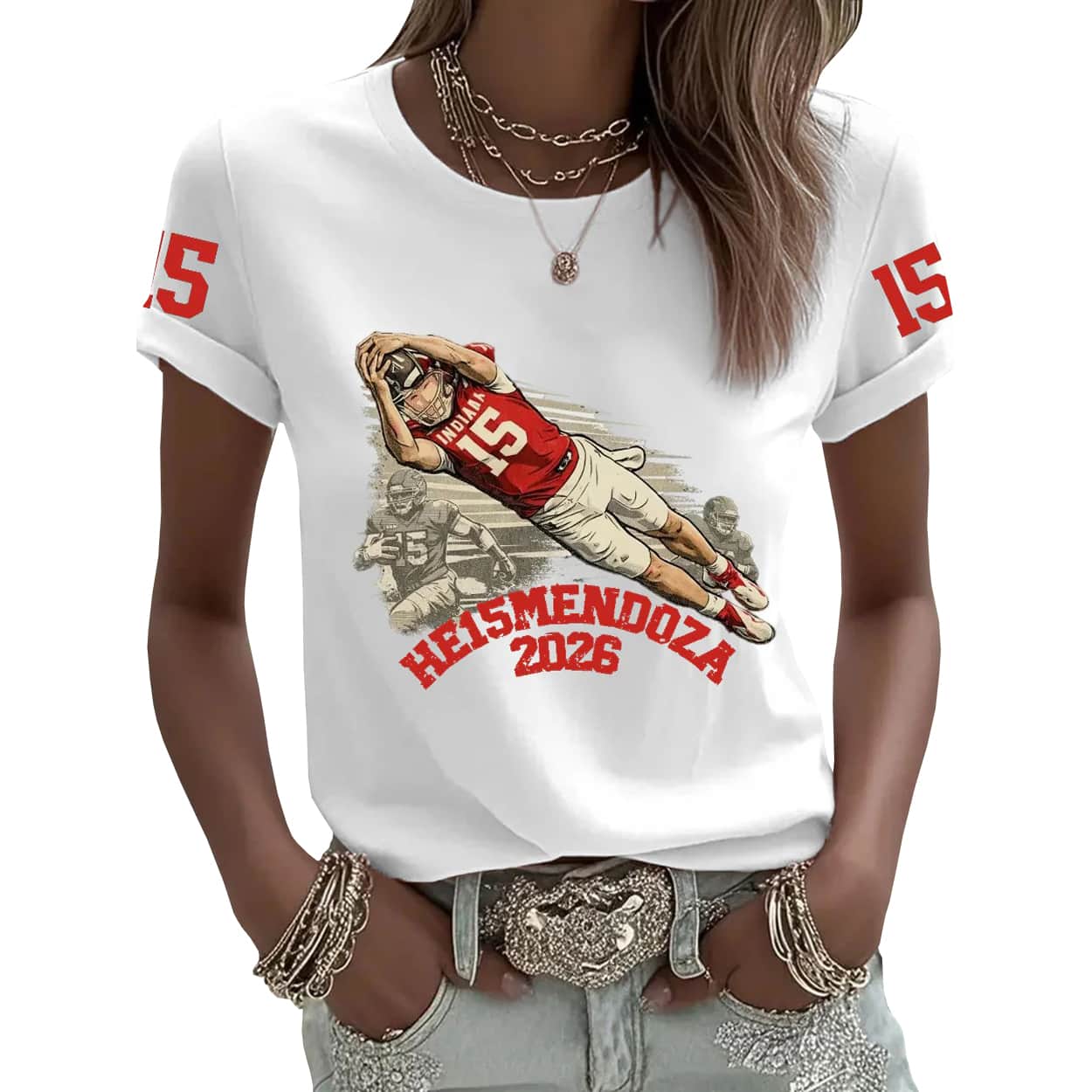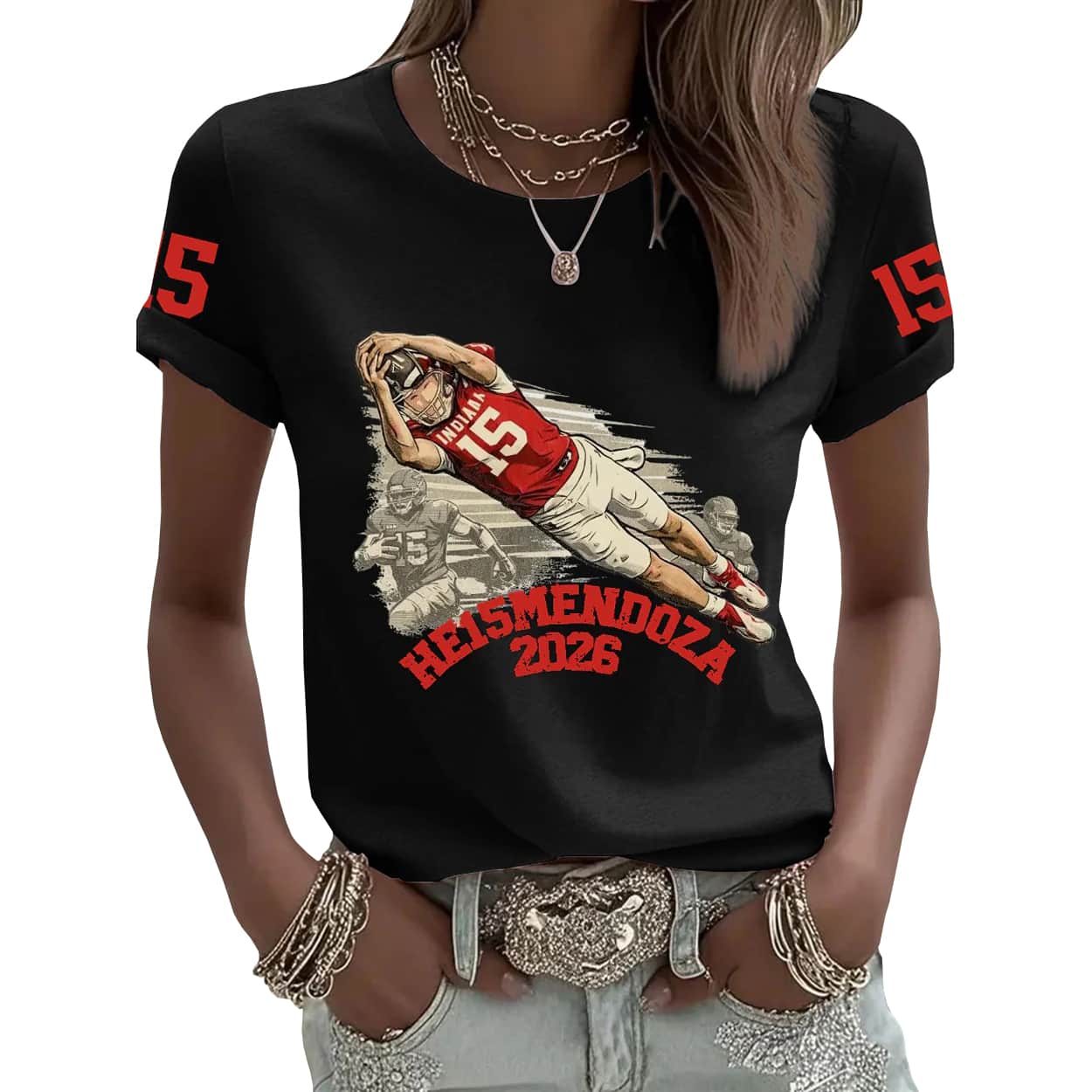 Get ready to dominate the stands with this shirt. This shirt is designed for those who live and breathe Indiana football, featuring a high-action graphic of a number 15 player mid-air, snatching victory with an incredible diving catch. The design is accented by the number 15 prominently displayed on the sleeves, ensuring that your team loyalty is visible from every single angle. It’s more than just a shirt; it’s a wearable highlight reel that captures the pure adrenaline of a game-winning drive.