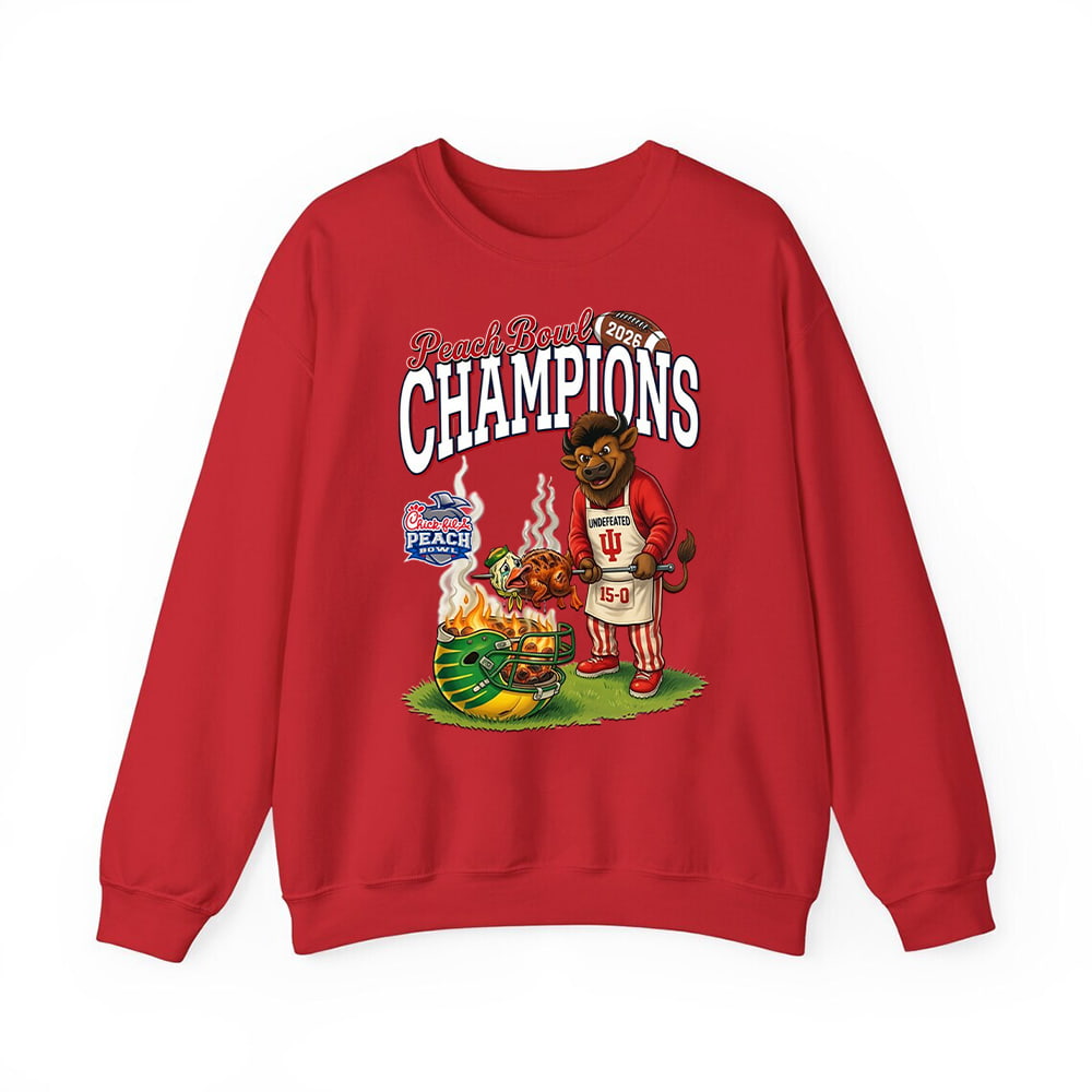 The design offers a playful, high-energy take on the Indiana-Oregon rivalry that defined the playoffs. It features the iconic IU Bison mascot wearing an “UNDEFEATED” apron while roasting a certain Oregon Duck over a flaming green helmet. This “Duck Roast” is a cheeky, stylized tribute to the Hoosiers’ clinical performance in the semifinal. With “CHAMPIONS” emblazoned in arched white text and the official Peach Bowl logo, this statement piece is built for fans who appreciate a little “trash talk” backed up by trophy-winning results.