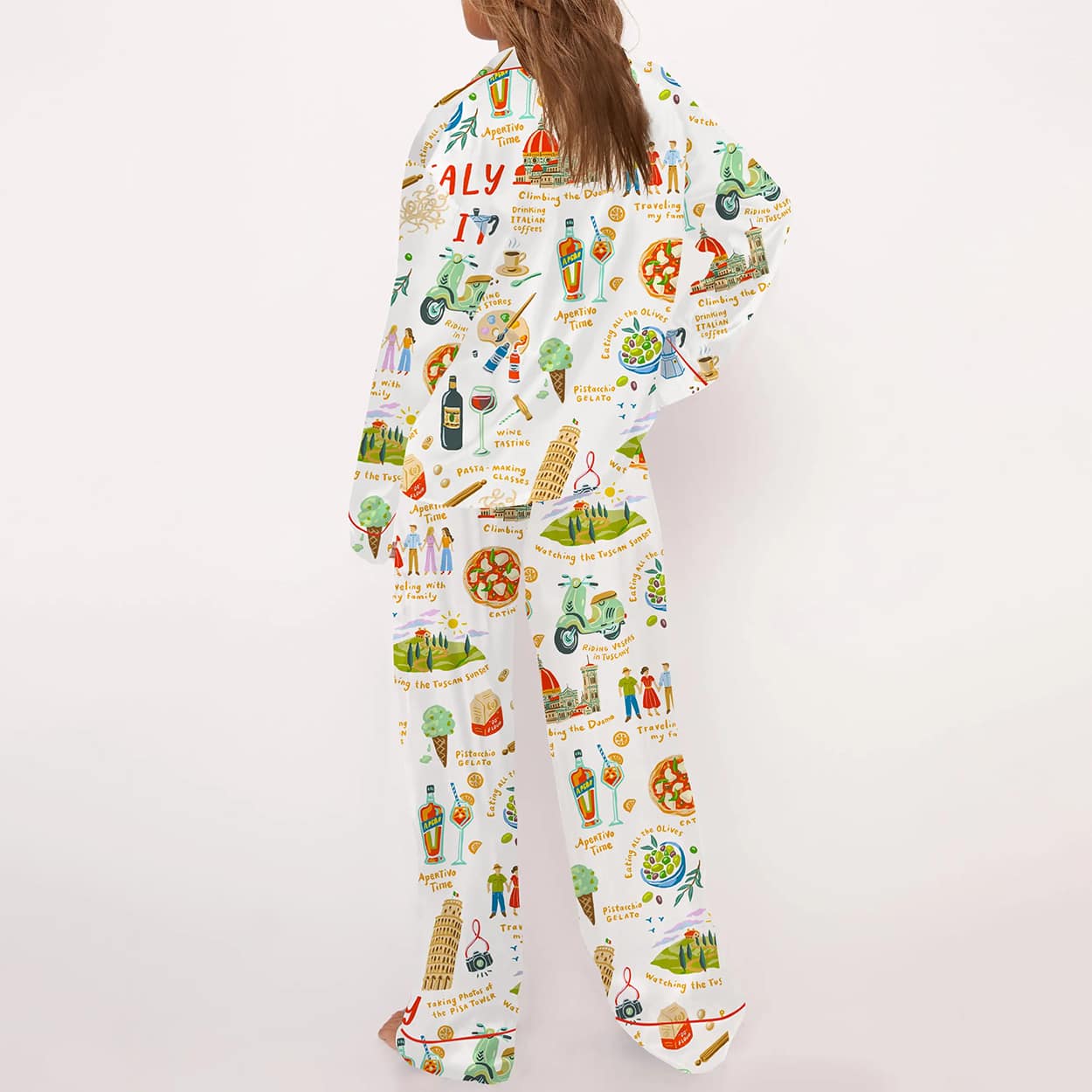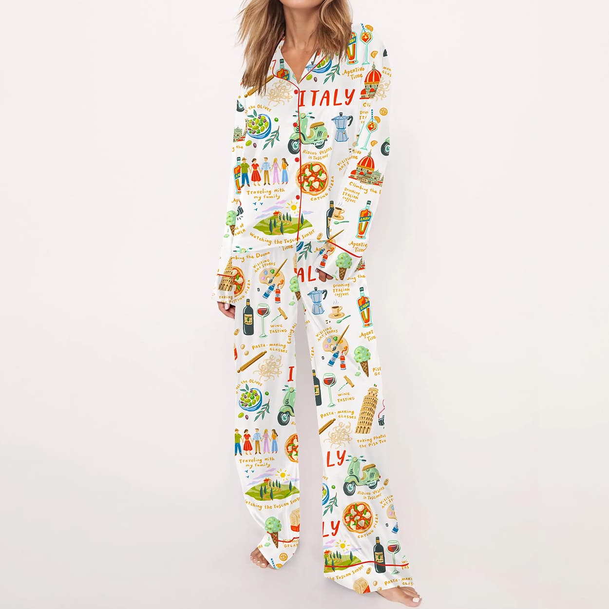 This pajama set is for dreamers, travelers, and lovers of la dolce vita. It’s a wearable postcard from Italy, designed to spark joy and conversation. The whimsical artwork captures the essence of Italian life—its food, landmarks, and spirited people—through a vibrant, cartoon-like lens. It’s not just sleepwear; it’s a celebration of culture and creativity for those who dare to wear their passions.