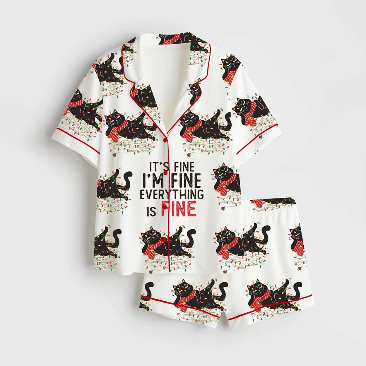 Say hello to your new favorite holiday mood booster. This matching ensemble features a short-sleeved button-up shirt and shorts, both decked out in a crisp white fabric sprinkled with black cats wearing red scarves, lounging among scattered autumn leaves. Red piping adds a pop of color along the collar, button line, sleeve edges, and hem. Front and center, the shirt boldly declares your seasonal mantra in all caps: “IT’S FINE I’M FINE EVERYTHING IS FINE.” It’s the perfect outfit for sipping cocoa, doomscrolling in style, or surviving awkward family dinners with a wink.