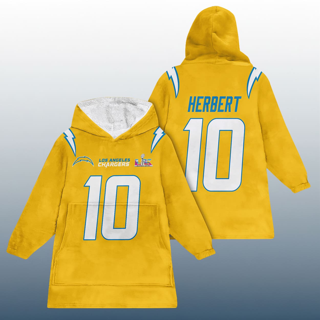 Charge into comfort and style with this hoodie. This hoodie is a game-changer, featuring the bold number “10” front and back in crisp white and electric yellow—an unmistakable nod to quarterback Justin Herbert. The front proudly displays “CHARGERS” across the chest, while the back showcases “HERBERT” above the number, making it clear who’s leading your fan squad. Yellow lightning bolts streak across the shoulders, adding a jolt of team energy that’s impossible to ignore.