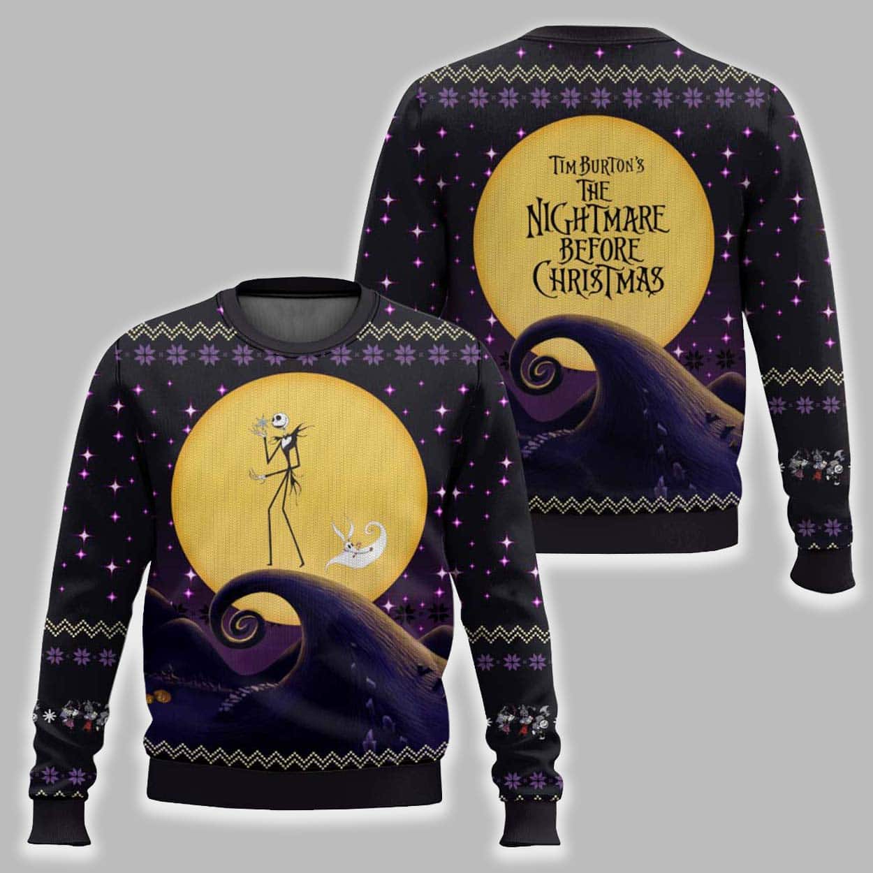 This stunning pullover is the perfect “Ugly Christmas Sweater” for any Tim Burton fan. The black, knit-style design is covered in festive-yet-spooky purple snowflakes and stars. The front features the unforgettable, iconic scene of Jack Skellington, the Pumpkin King, standing on Spiral Hill with his loyal ghost-dog, Zero, floating by his side. The back of the sweater completes the tribute, showcasing the full “Tim Burton’s The Nightmare Before Christmas” logo against the giant moon.