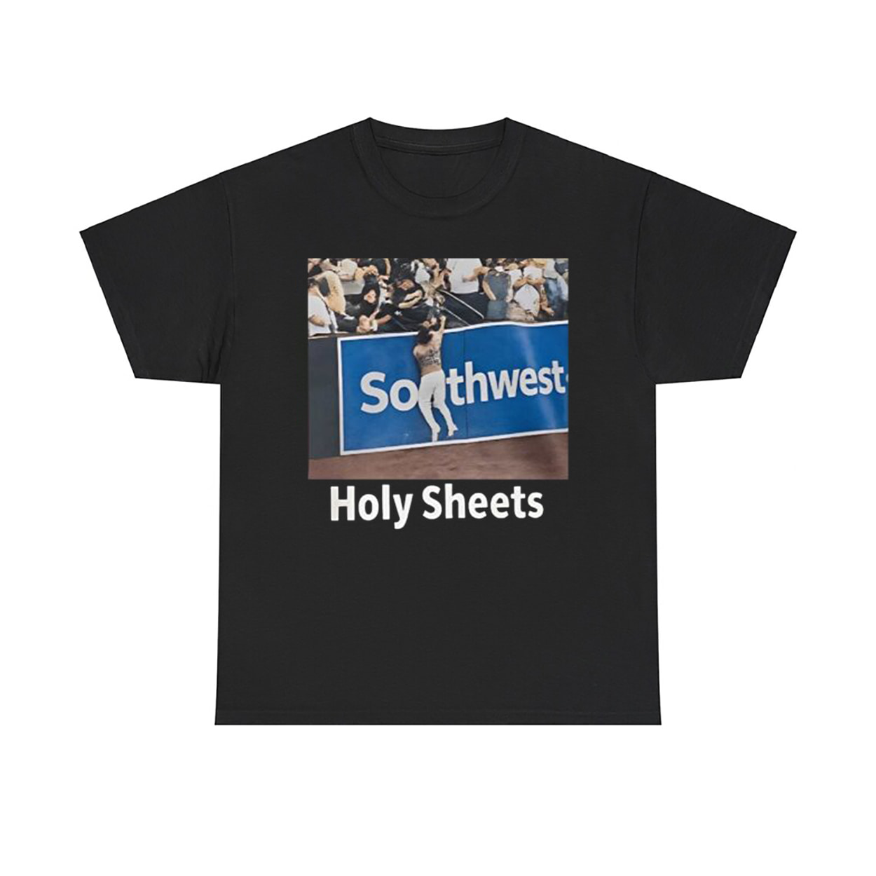 This shirt is more than just fan gear—it’s a snapshot of pure baseball magic. The front features a striking photograph of Padres star Jackson Merrill making an incredible catch at the outfield wall, with the crowd frozen in awe behind him. Beneath the image, the bold white text “Holy Sheets” delivers a cheeky twist, blending admiration with wordplay that makes this shirt impossible to ignore.