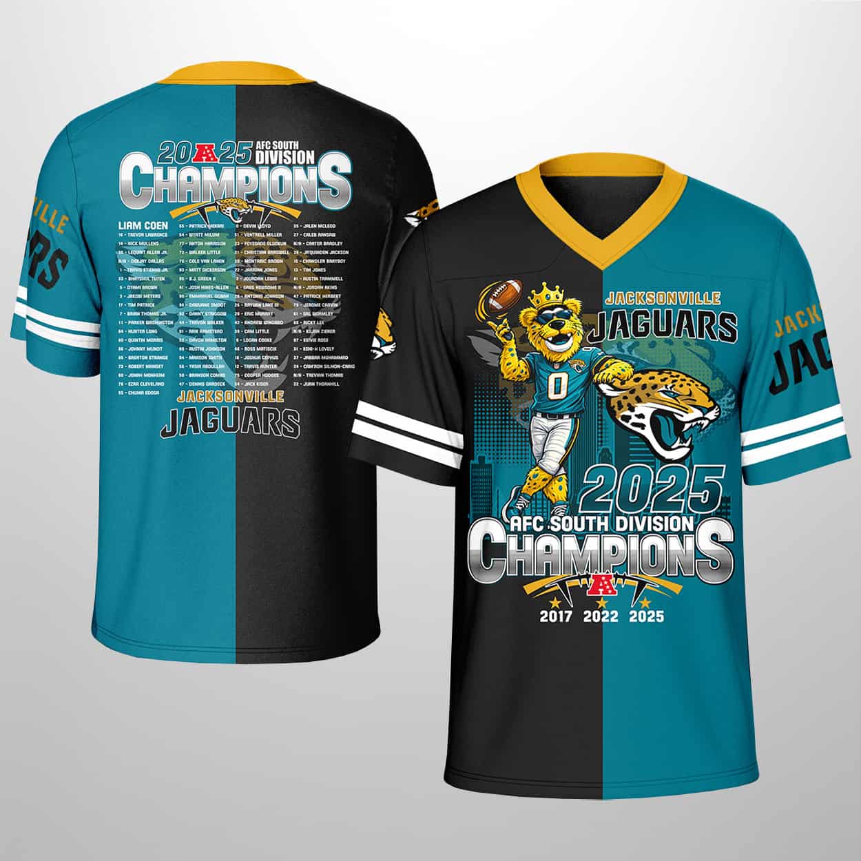 This jersey is a must-have for die-hard fans ready to flaunt their team’s dominance. With a striking split design in teal and black, accented by white sleeve stripes and a pop of yellow at the collar, this jersey screams victory. The front showcases the Jaguars mascot rocking a “0” jersey beside a fierce jaguar head logo, while bold text proudly declares: “JAGUARS 2025 AFC SOUTH DIVISION CHAMPIONS 2017 2022 2025.” Turn it around and the celebration continues with “2025 AFC SOUTH DIVISION CHAMPIONS” and “JAGUARS” emblazoned across the back, along with a roll call of names that helped make history.