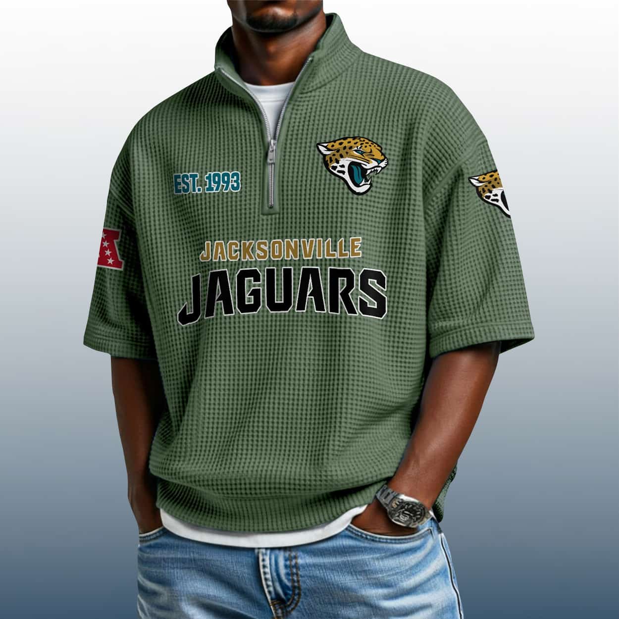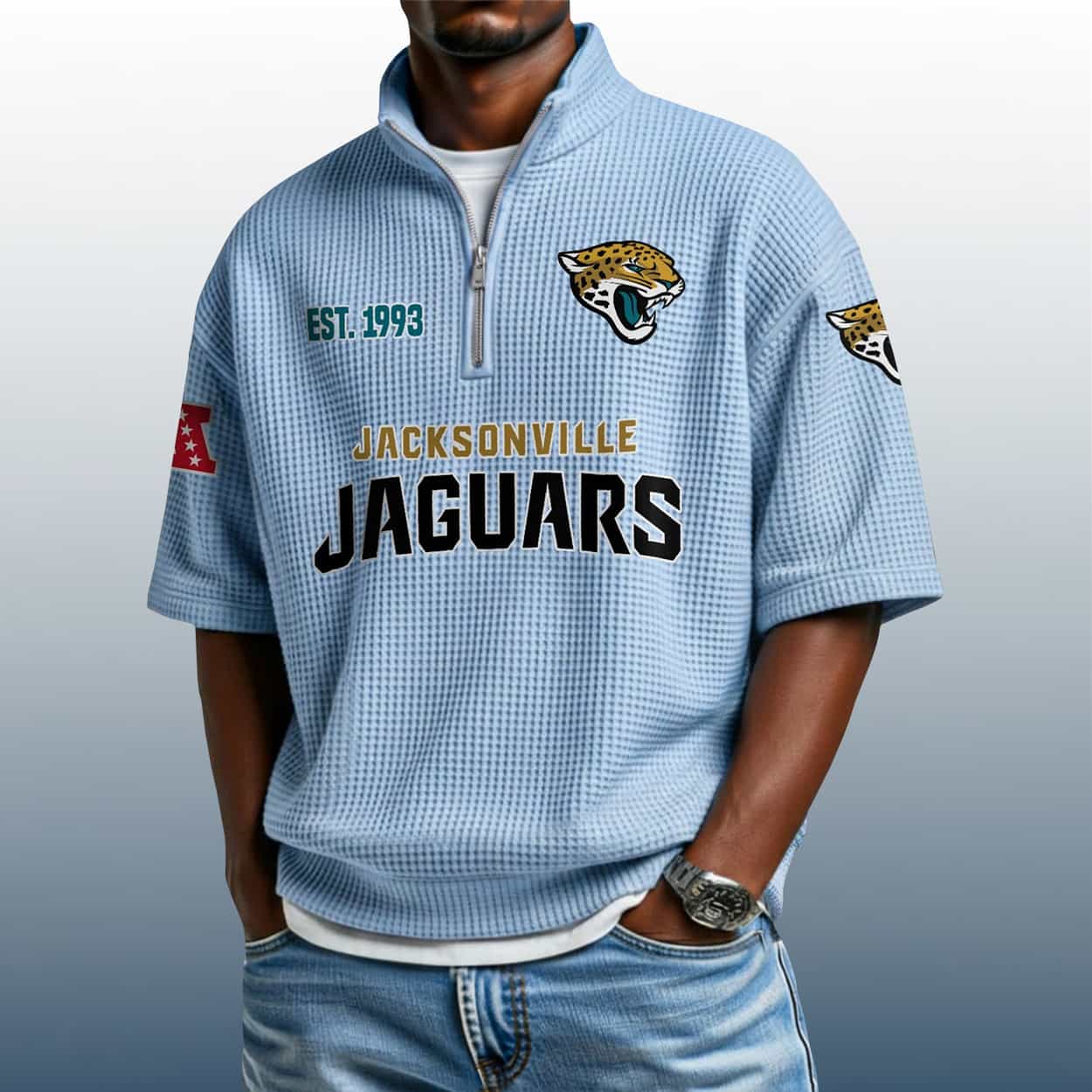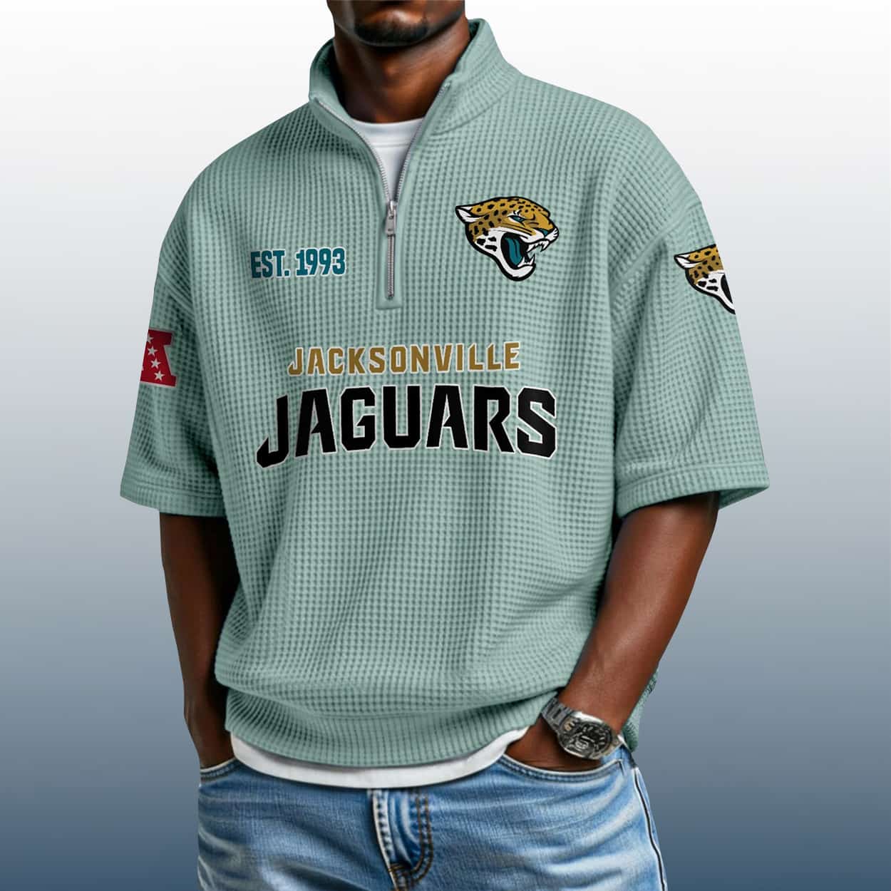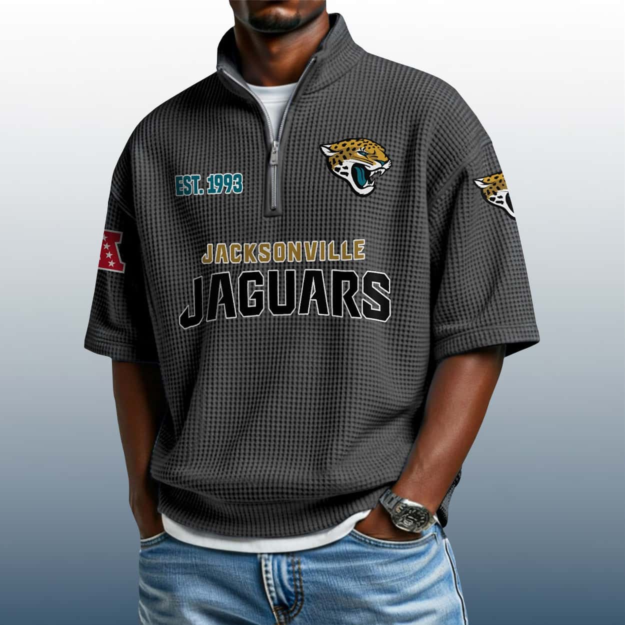 Unleash your inner Jaguar with the Jaguars Est 1993 Waffle Stand Collar Half Zip Polo Shirt—where bold design meets fierce fandom. A textured tribute to Jacksonville’s gridiron pride.