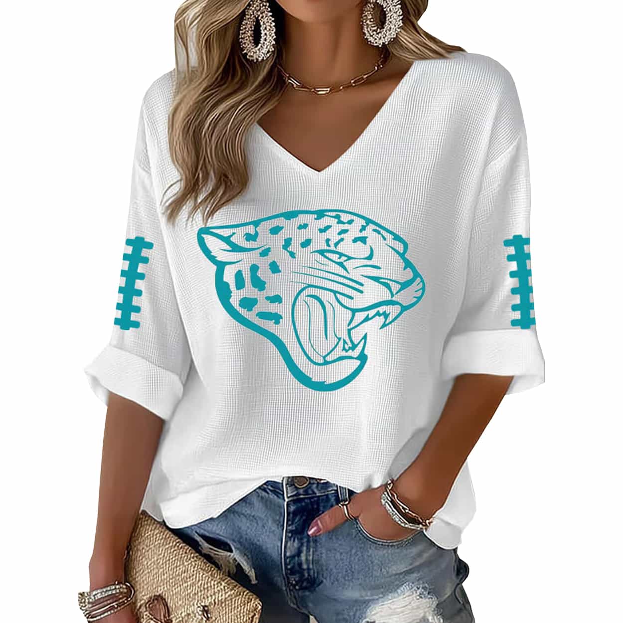 This isn’t just a nod to football—it’s a salute to fierce individuality. The jaguar graphic channels raw energy and fearless spirit, perfect for fans who don’t just cheer—they lead the charge. The lace-up sleeves add a touch of athletic flair, making this top a wearable tribute to strength, style, and unapologetic fandom.