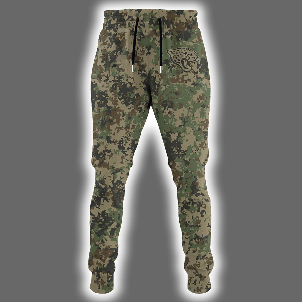 Step into the spotlight with the Jaguars US Army 250th Birthday Celebration Night Game 2025 Hoodie Joggers Cap—a bold fusion of battlefield honor and football fire. This trio includes a custom hoodie, joggers, and cap, each designed to turn heads and stir hearts. The hoodie features a fierce jaguar head graphic on the chest, flanked by two nameplates—one labeled “CUSTOM NAME” for personalization, and the other proudly reading “JAGUARS.” The sleeves and lower panels sport a rugged camouflage pattern, while American flag patches add a patriotic punch. On the back, “JAGUARS” dominates the top, followed by a white star with “EST. 1775” inside, the golden number “250” front and center, and the powerful motto “U.S. ARMY – THIS WE’LL DEFEND” anchoring the design. The joggers echo the camo-and-olive theme with sleek detailing, and the cap completes the look with printed insignia and a starburst that commands attention.