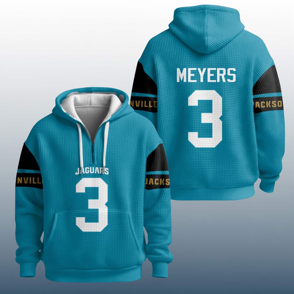 Get ready to elevate your fan game with this hoodie—a teal masterpiece that blends jersey flair with street-ready attitude. The front proudly displays “JAGUARS” in crisp white lettering above a bold number “3,” making it clear who you’re backing. Flip it around and you’ll find “MEYERS” printed loud and proud above the same number, giving this hoodie serious wide receiver energy.