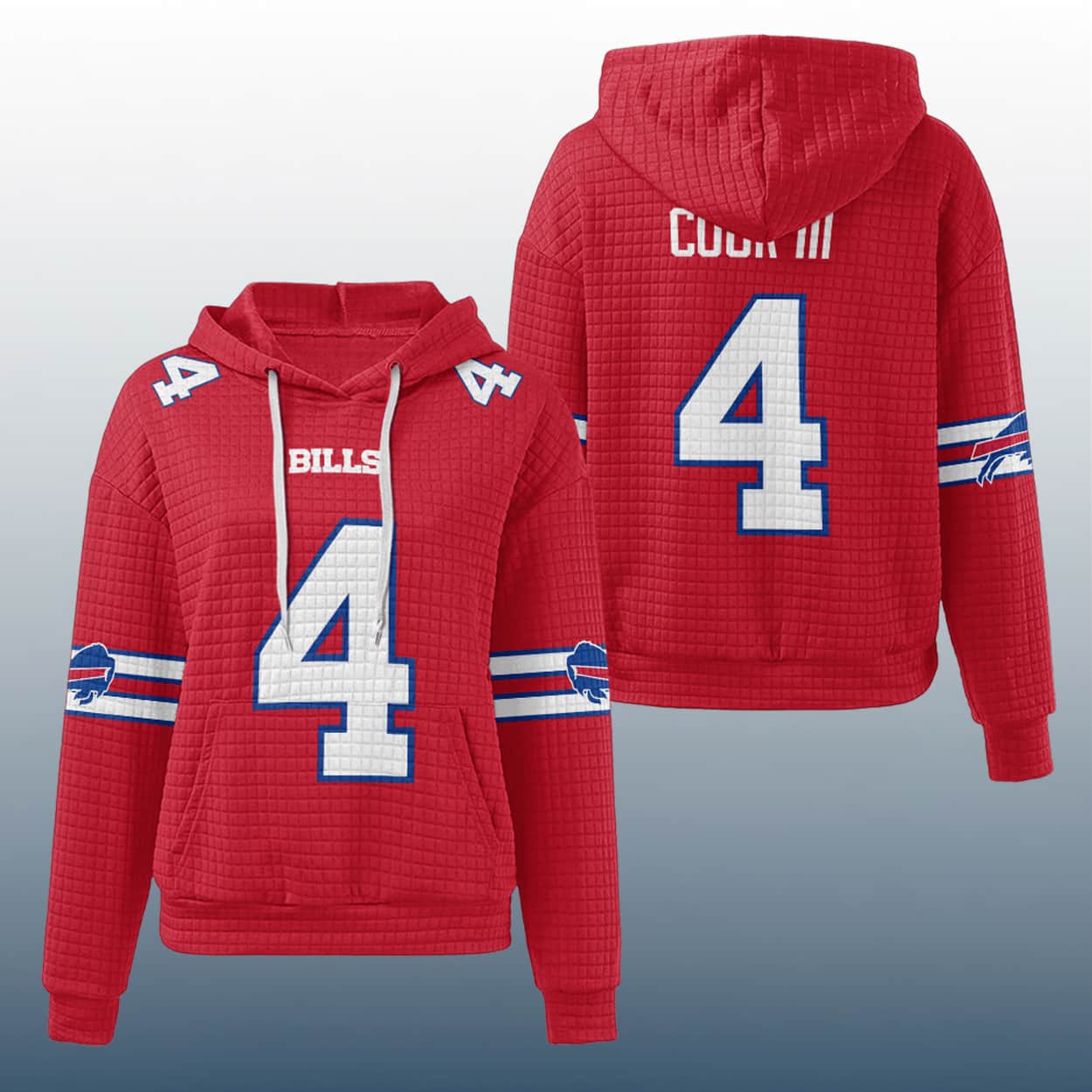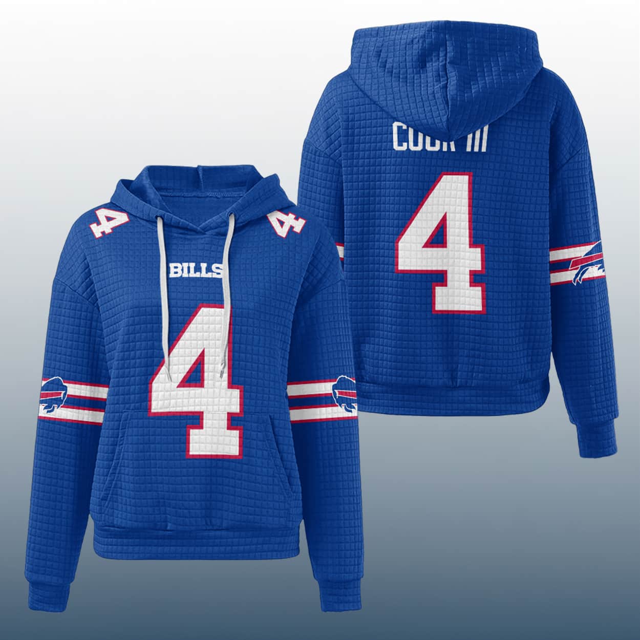 Turn heads and rep your team with this hoodie. The front proudly displays “BILLS” above a crisp, oversized number “4” outlined in red and blue, with matching digits on both shoulders for that authentic gridiron feel. Flip it around and you’ll find “COOK III” stamped above the number “4” on the back, making it clear who you’re backing. With red and white sleeve stripes and the iconic Bills logo on each arm, this hoodie doesn’t just whisper team spirit—it shouts it.