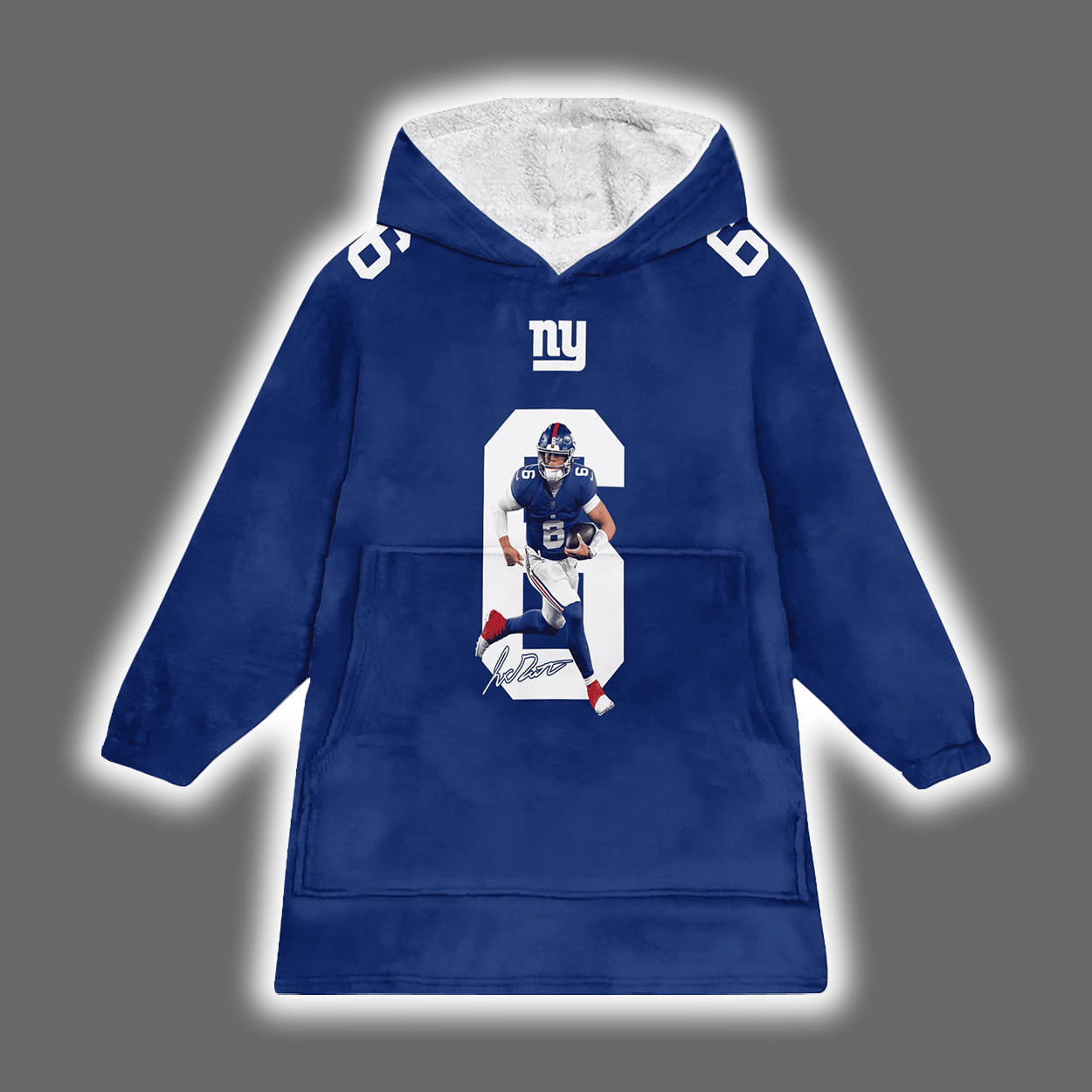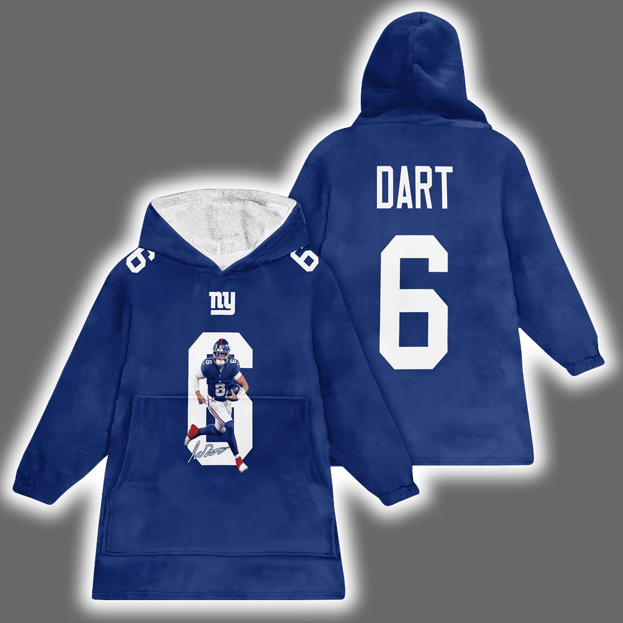 Get ready to rep your squad in full force with this hoodie. This oversized hoodie is drenched in Giants blue and features a standout number “6” on the front, creatively infused with an action-packed image of Dart in his New York uniform. Above the number, the iconic Giants logo sits proudly, anchoring the design in team tradition. Flip it around and you’ll find “DART” in bold white lettering above a crisp number “6,” making it clear who you’re backing. It’s a wearable shoutout to a rising star and a nod to the city that never sleeps.