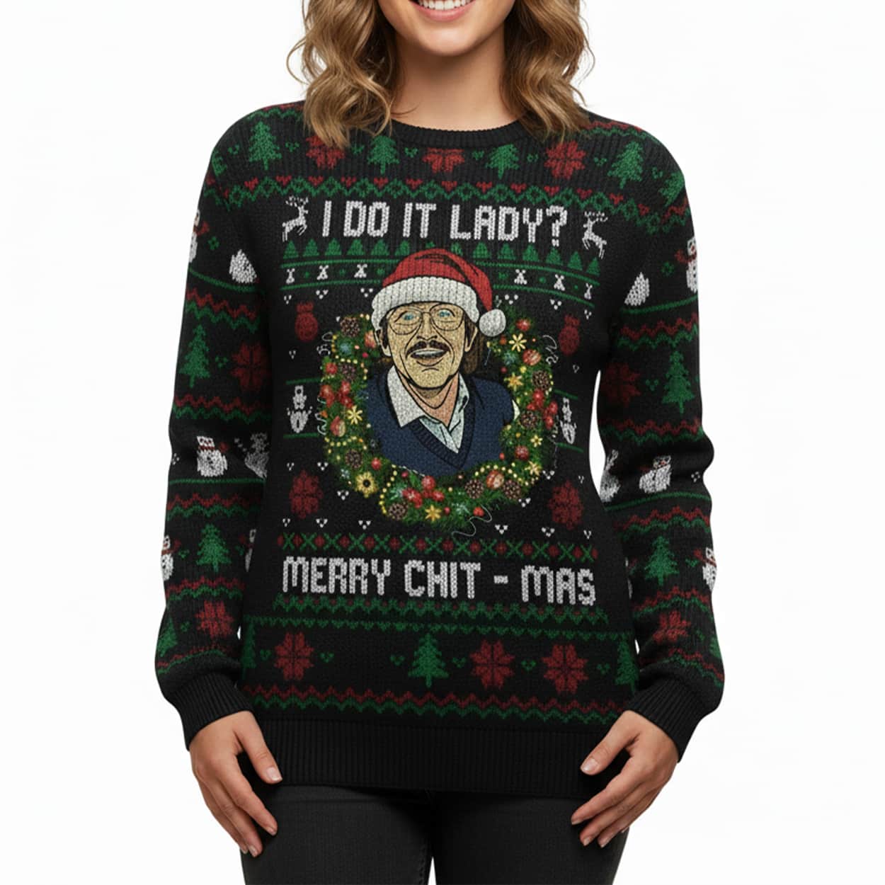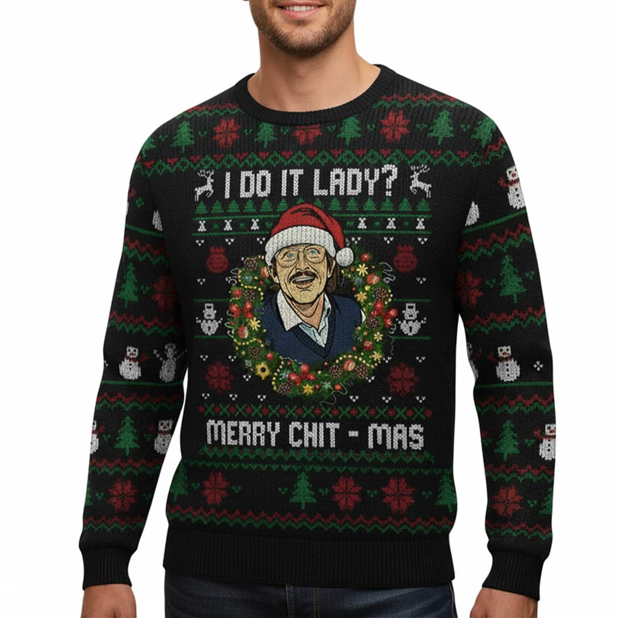 This sweater is not your average seasonal knit. Drenched in classic holiday colors—black, red, green, and white—it features a riot of festive icons: snowflakes, reindeer, snowmen, and Christmas trees. But the real showstopper? A cartoon-style man in a Santa hat, framed by a holiday wreath, flashing a mischievous grin. Above him, the phrase “I DO IT LADY?” adds a cheeky twist, while “MERRY CHIT – MAS” below seals the deal with pun-filled holiday humor. It’s the perfect blend of irreverence and yuletide cheer.
