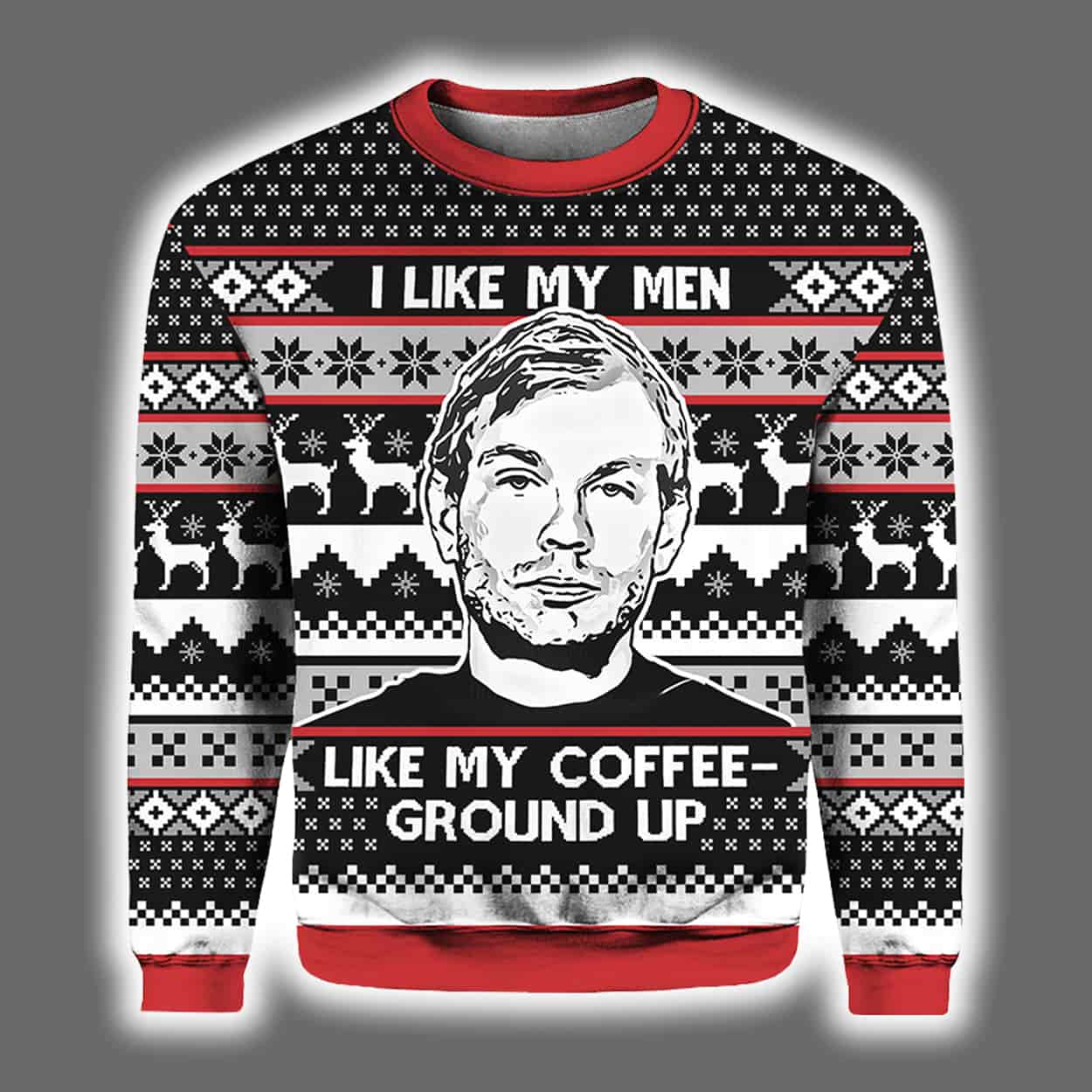 Unleash holiday havoc with this sweater. The front features a stark black-and-white portrait of Jeffrey Dahmer, framed by festive snowflakes and reindeer in red, white, and black. Bold red text proclaims “I LIKE MY MEN,” setting up the back’s punchline: “LIKE MY COFFEE – GROUND UP,” surrounded by playful pine and star patterns. This design blends cozy holiday vibes with macabre wit, making it the ultimate standout at any ugly sweater bash.
