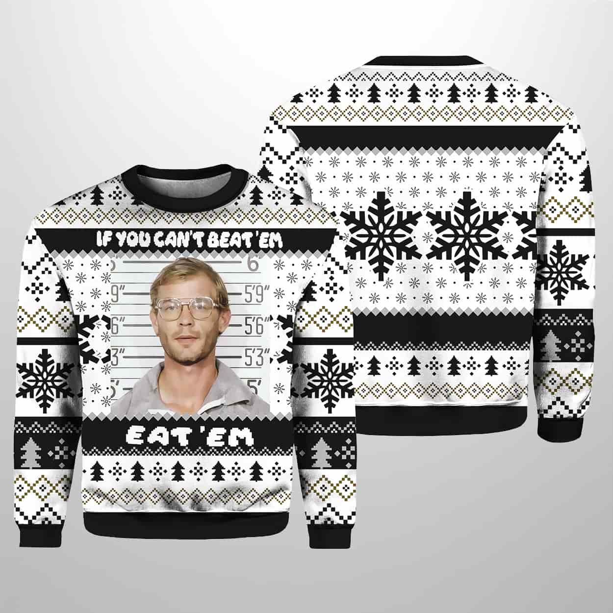 Push the boundaries of holiday fashion with the Jeffrey Dahmer If You Can’t Beat ‘Em Eat ‘Em Ugly Sweater—dark humor meets festive flair.