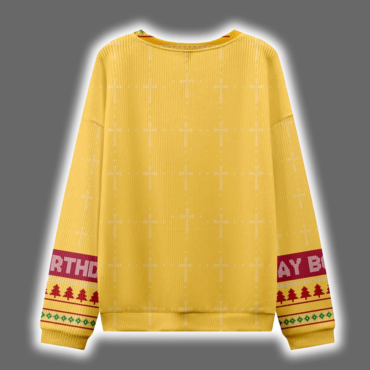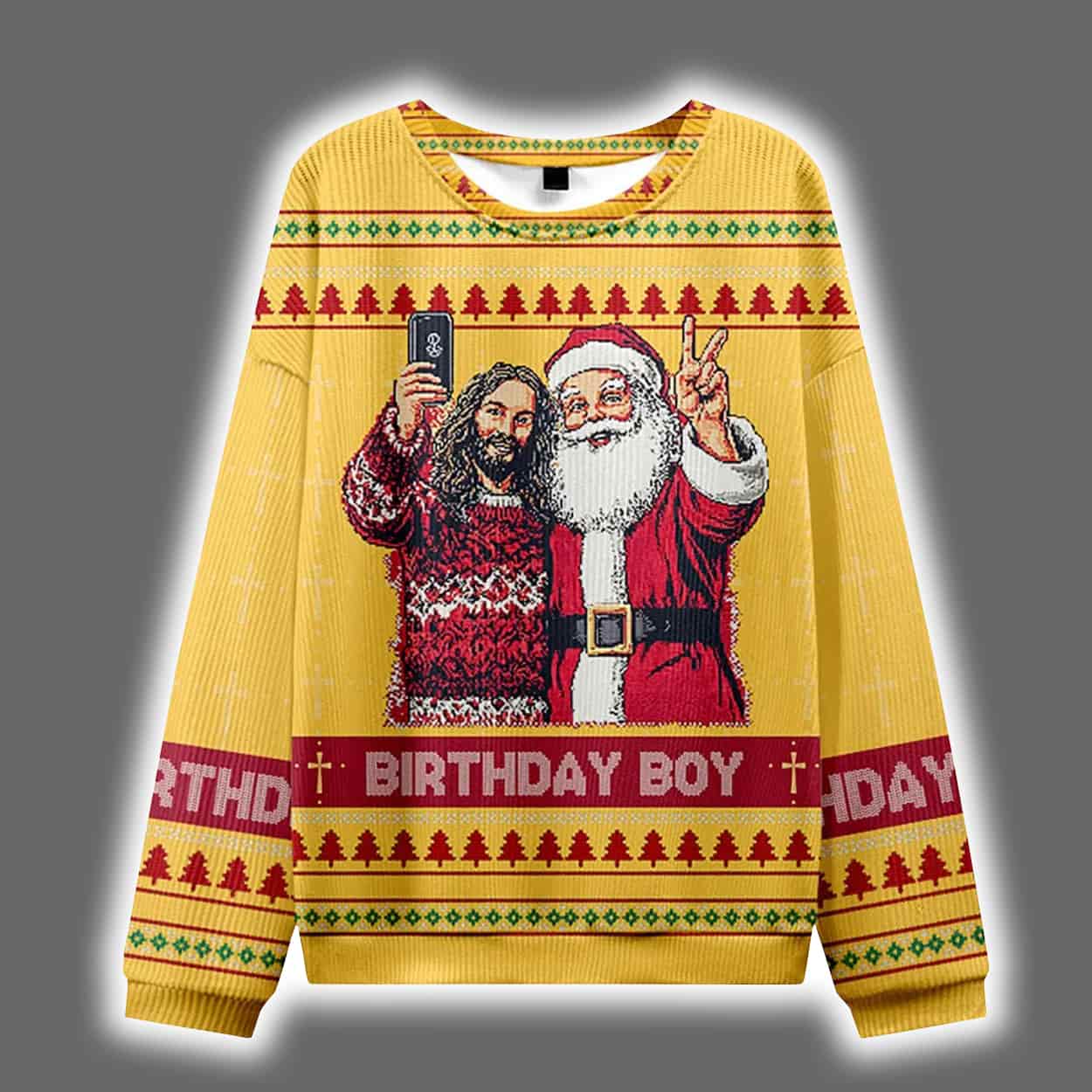 Turn heads and spark conversations with this sweater, a bold blend of holiday cheer and cheeky charm. Set against a bright yellow backdrop, this festive masterpiece features red and green accents, snowflakes, Christmas trees, and crosses. The centerpiece? A hilarious graphic of Jesus and Santa Claus snapping a selfie—Jesus holds the phone while Santa flashes a peace sign, both decked out in holiday gear and grinning like old pals. Across the chest and sleeves, the phrase “BIRTHDAY BOY” beams in bold white letters on a red band, reminding everyone whose party it really is.