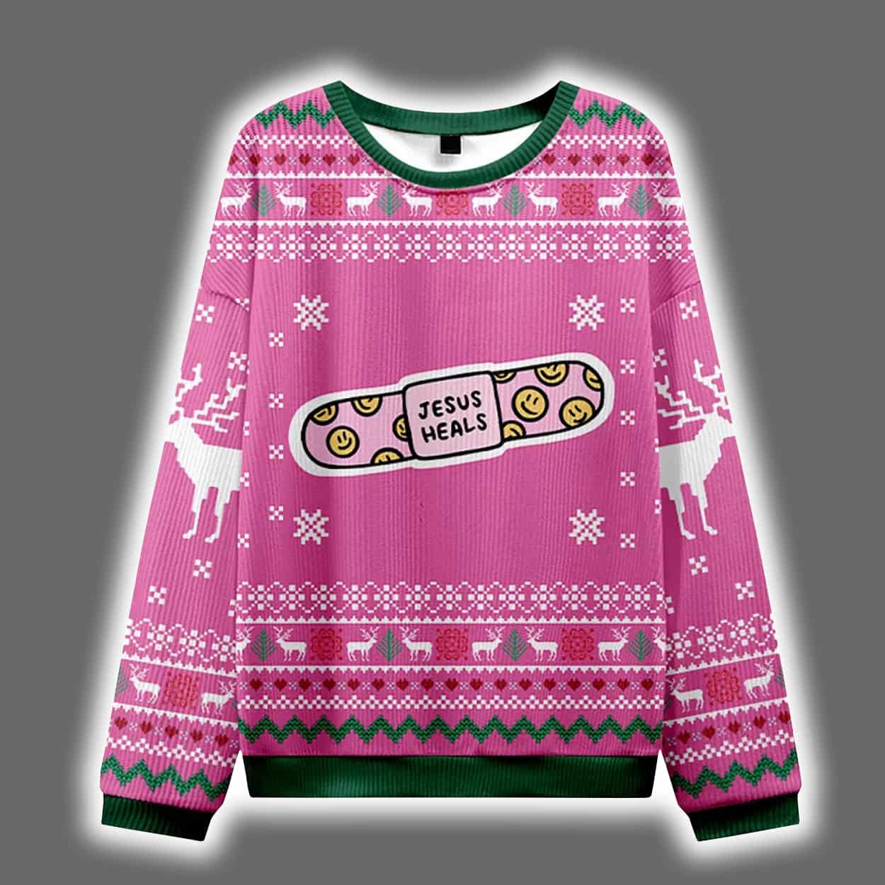 This isn’t your average ugly Christmas sweater—it’s a joyful proclamation wrapped in red and green holiday charm. Featuring classic festive motifs like snowflakes, reindeer, and geometric patterns, this sweater brings the Christmas spirit to life. But the centerpiece steals the show: a bright green bandage adorned with cheerful smiley faces, boldly declaring “JESUS HEALS.” It’s playful, eye-catching, and deeply meaningful—a wearable reminder of hope and healing during the most wonderful time of the year.