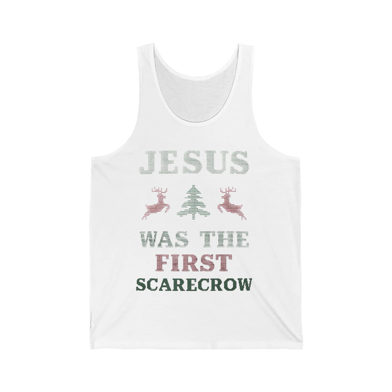 Make a statement that blends faith, humor, and style with this shirt. This clever design brings together Christian symbolism and satirical art in a way that’s both eye-catching and thought-provoking. The shirt features bold text in festive colors: “JESUS” and “SCARECROW” in green, “FIRST” in red, and “WAS THE” in gray. Between the lines, two red reindeer flank a green pine tree, adding a whimsical holiday twist to the message. It’s perfect for those who love funny religious shirts with deeper meaning.