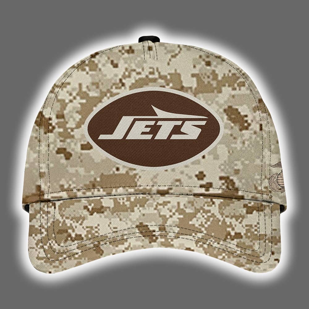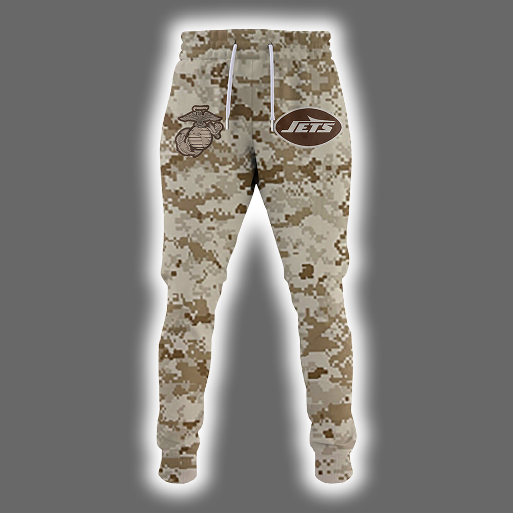 This set is where battlefield valor meets end-zone energy. The hoodie features a rugged brown-and-camo combo, with “YOUR NAME” and “JETS” tags on the chest, plus a bold oval Jets logo front and center. The left sleeve sports an American flag patch, while the back steals the show with a stirring image of two soldiers raising the flag, Iwo Jima-style, set against a stylized American flag backdrop. The words “250 MARINE CORPS ANNIVERSARY” anchor the tribute with pride. The joggers continue the salute with matching camo and dual thigh logos—the Marine Corps eagle, globe, and anchor on one side, and the Jets football emblem on the other. The cap rounds out the look with a digital desert camo pattern and a bold brown oval patch reading “JETS” in crisp white lettering.