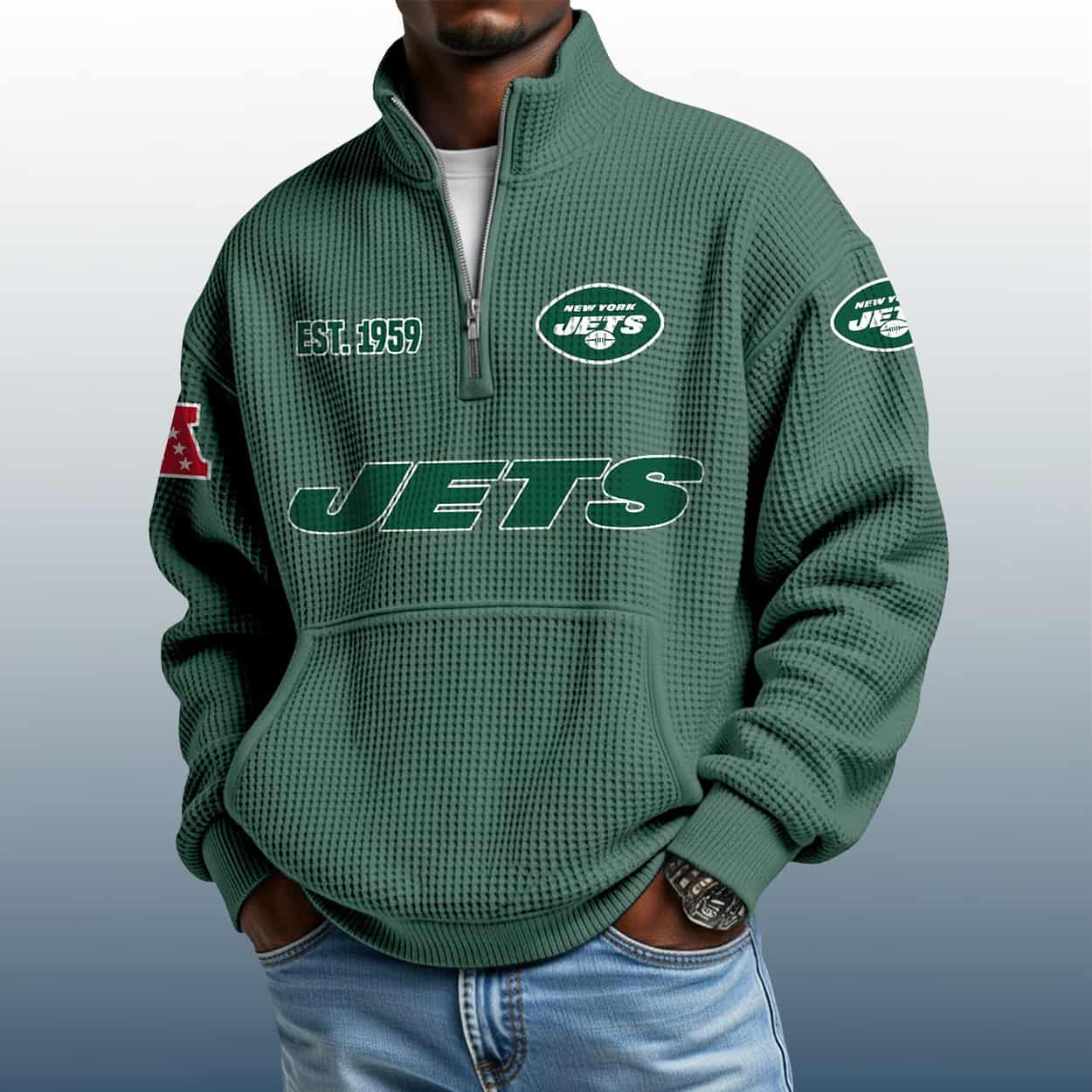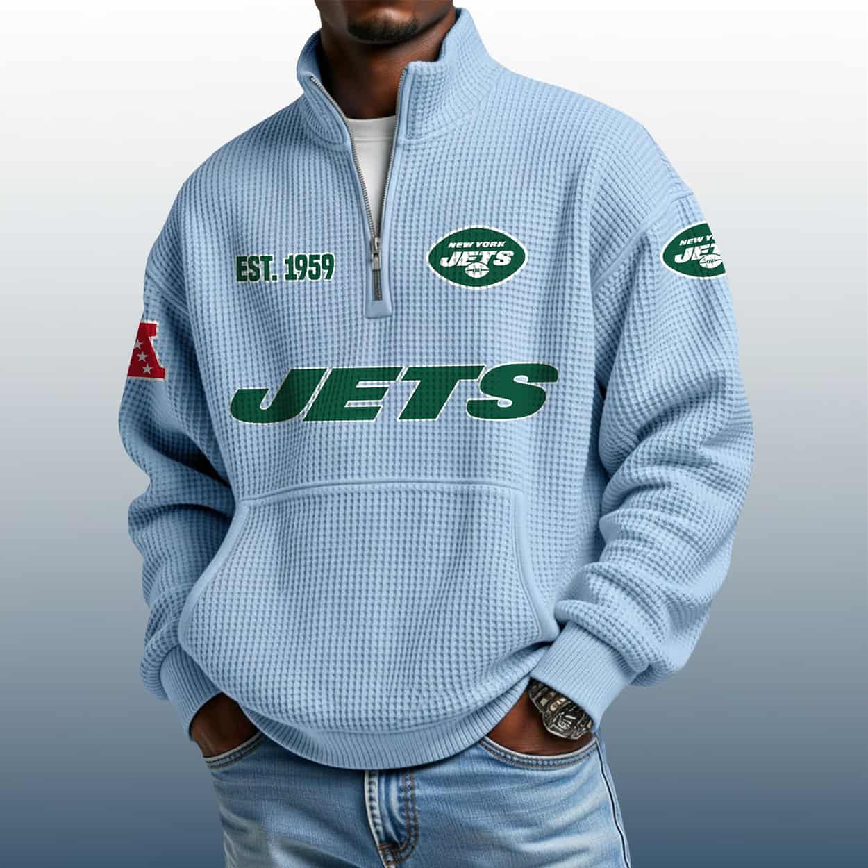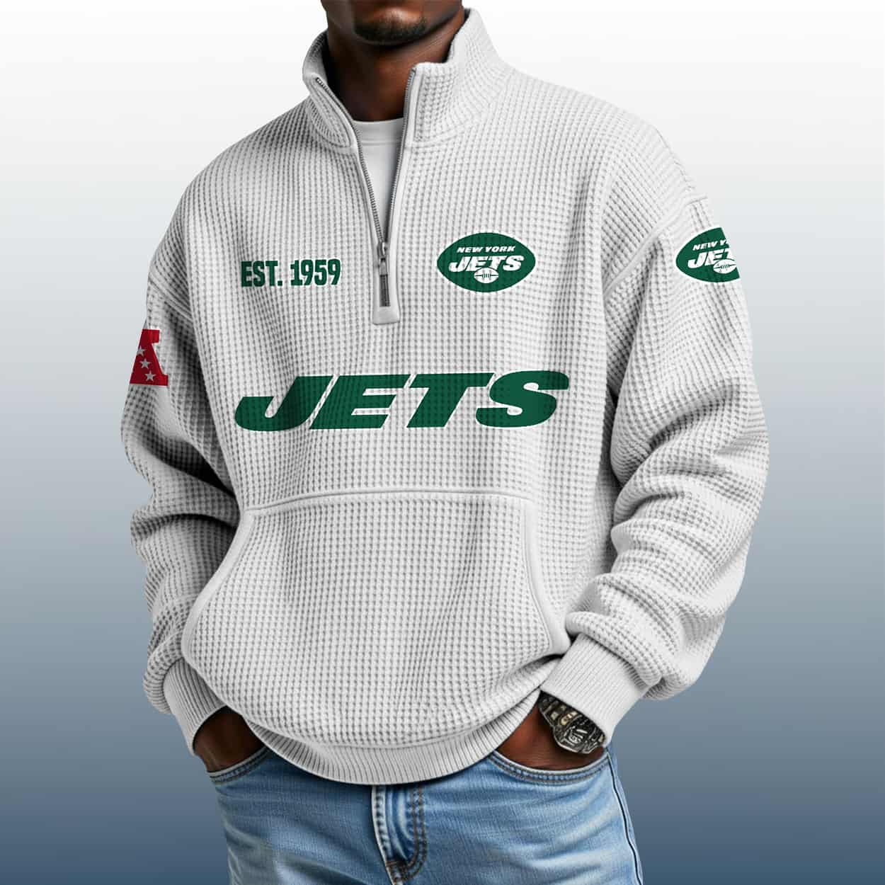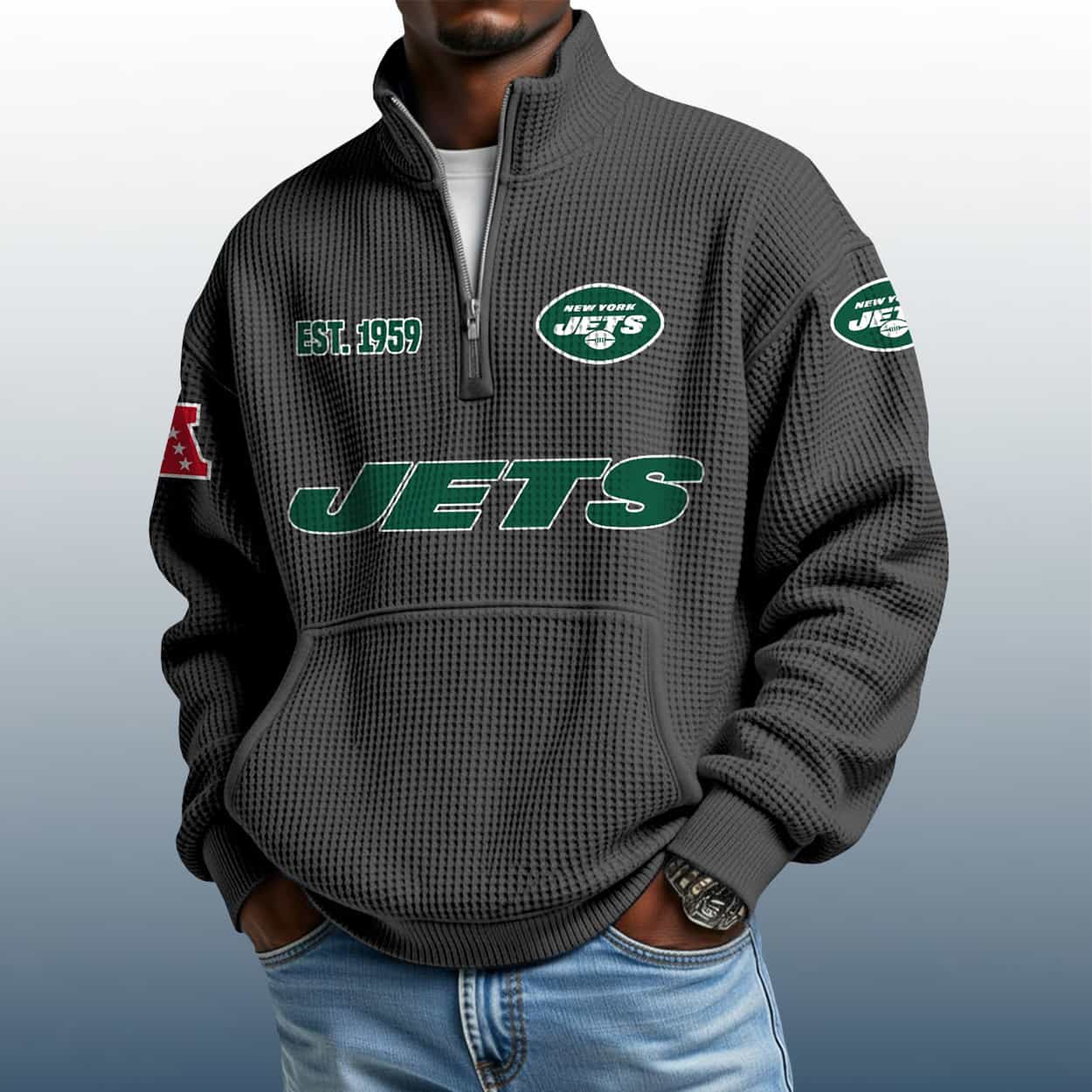 Be the first to review “Jets Est 1959 Stand Collar Half Zip Waffle Sweatshirt” Cancel reply