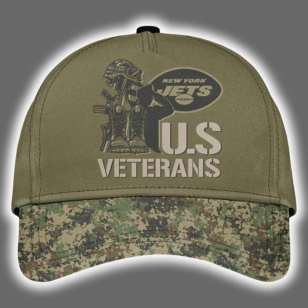 This unique collection is a visual blend of Jets pride and military respect. The hoodie features a custom name patch, allowing for a personalized touch. On the front, it proudly displays “UNITED STATES VETERAN” and an image of a rifle. The back and sleeves sport a dynamic camo pattern, while the back features a powerful graphic: a helmeted, armed figure representing a veteran, standing next to a large “U.S. VETERANS” text and the New York Jets logo. The joggers follow suit with the same camo pattern and a subtle Jets logo on the thigh. The cap ties the whole look together with its half-olive, half-camo design, featuring the same striking veteran graphic. It’s a playful, yet deeply respectful nod to the strength and dedication of both our military heroes and the New York Jets.