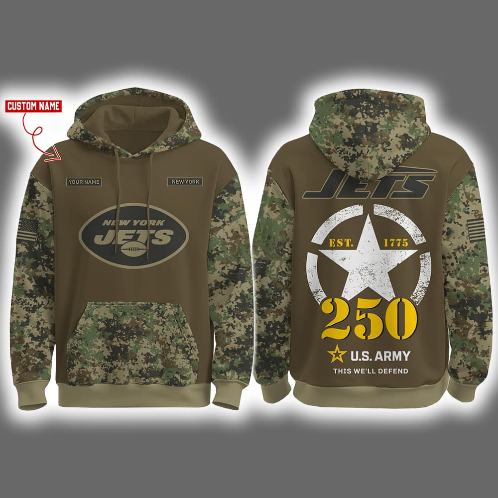 Introducing the Jets US Army 250th Birthday Celebration Night Game 2025 Hoodie Joggers Cap—a striking three-piece combo that includes a custom hoodie, joggers, and cap. The hoodie features a rugged olive green body with camouflage sleeves and hood, fronted by the unmistakable oval “NEW YORK JETS” logo and football graphic. Above it, two nameplates add a tactical twist: “CUSTOM NAME” on the left chest for personalization, and “JETS” on the right for team pride. Flip it around and the back makes a bold statement: “JETS” in large block letters, a white star emblem flanked by “EST. 1775,” and the number “250” in bold yellow. Beneath it, the motto reads: “U.S. ARMY – THIS WE’LL DEFEND.” The joggers carry the same camo-meets-military aesthetic, while the cap tops off the look with printed insignia and a structured fit that’s ready for action. A U.S. flag patch on the sleeve completes the salute.