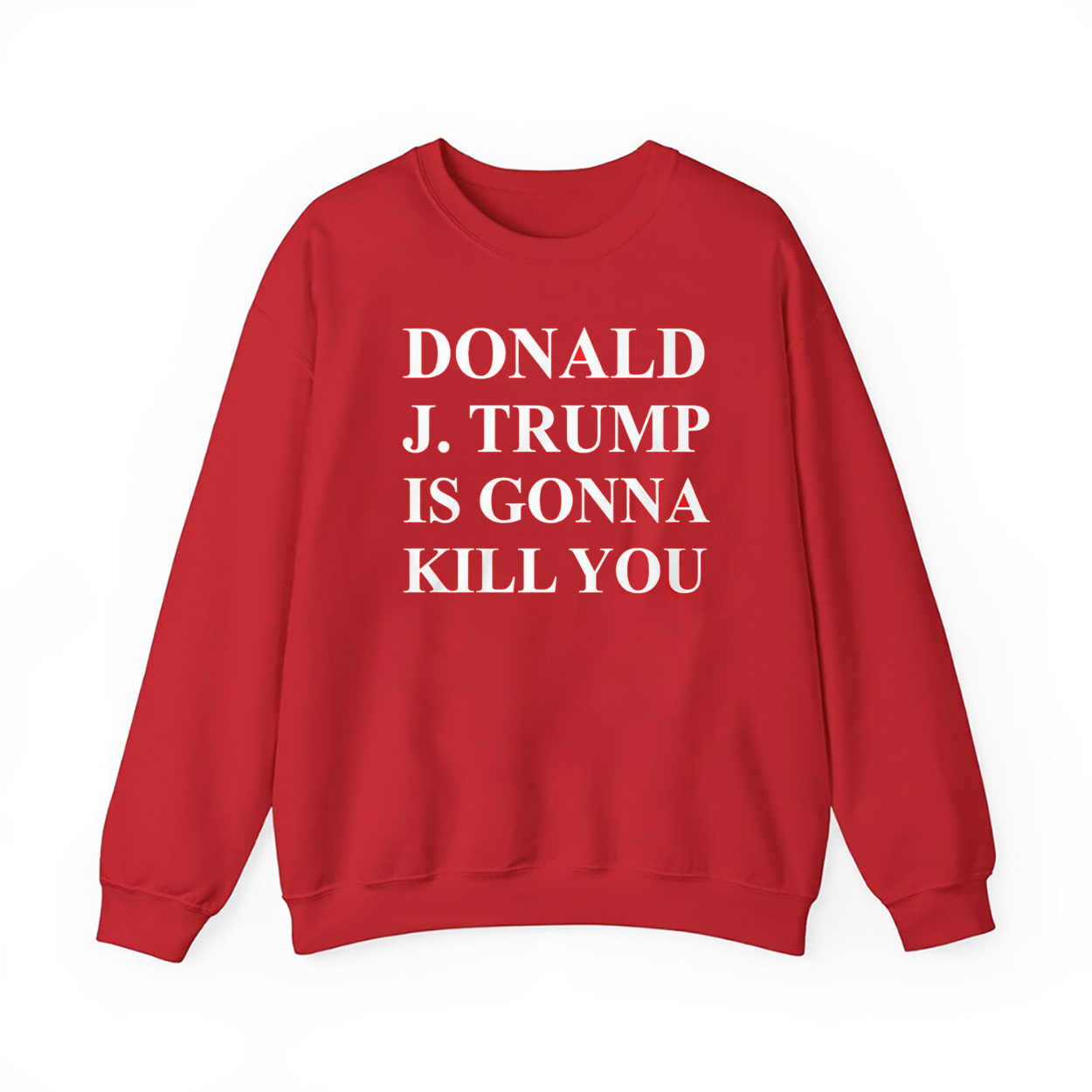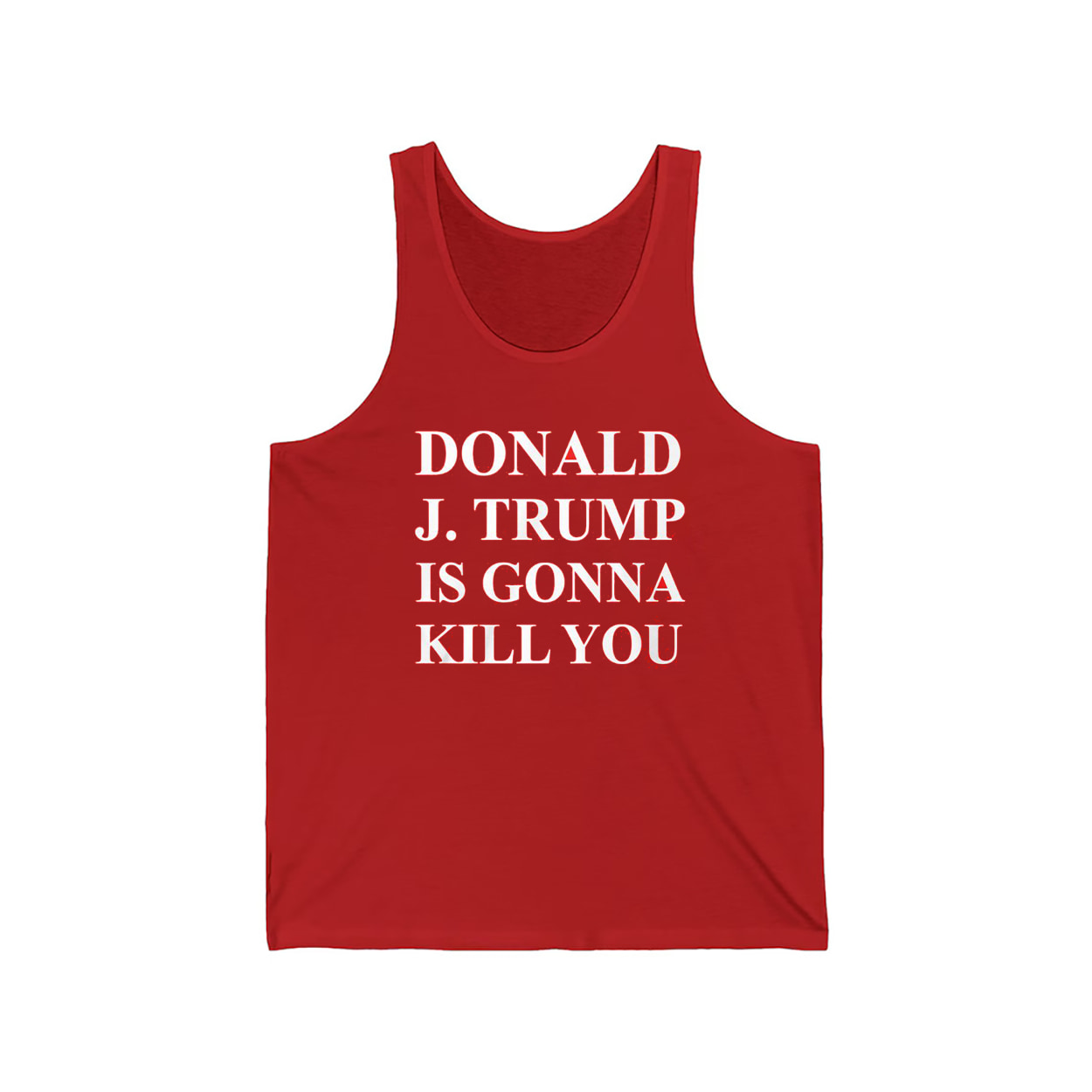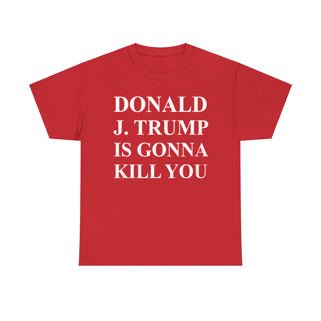This eye-catching red T-shirt features stark white block lettering that reads: “DONALD J. TRUMP IS GONNA KILL YOU” The design is intentionally jarring, provocative, and impossible to ignore. Whether you’re making a statement at a protest, sparking conversation at a party, or simply expressing your stance with unapologetic flair, this shirt delivers impact with every glance. It’s not just apparel—it’s a punchline with teeth.