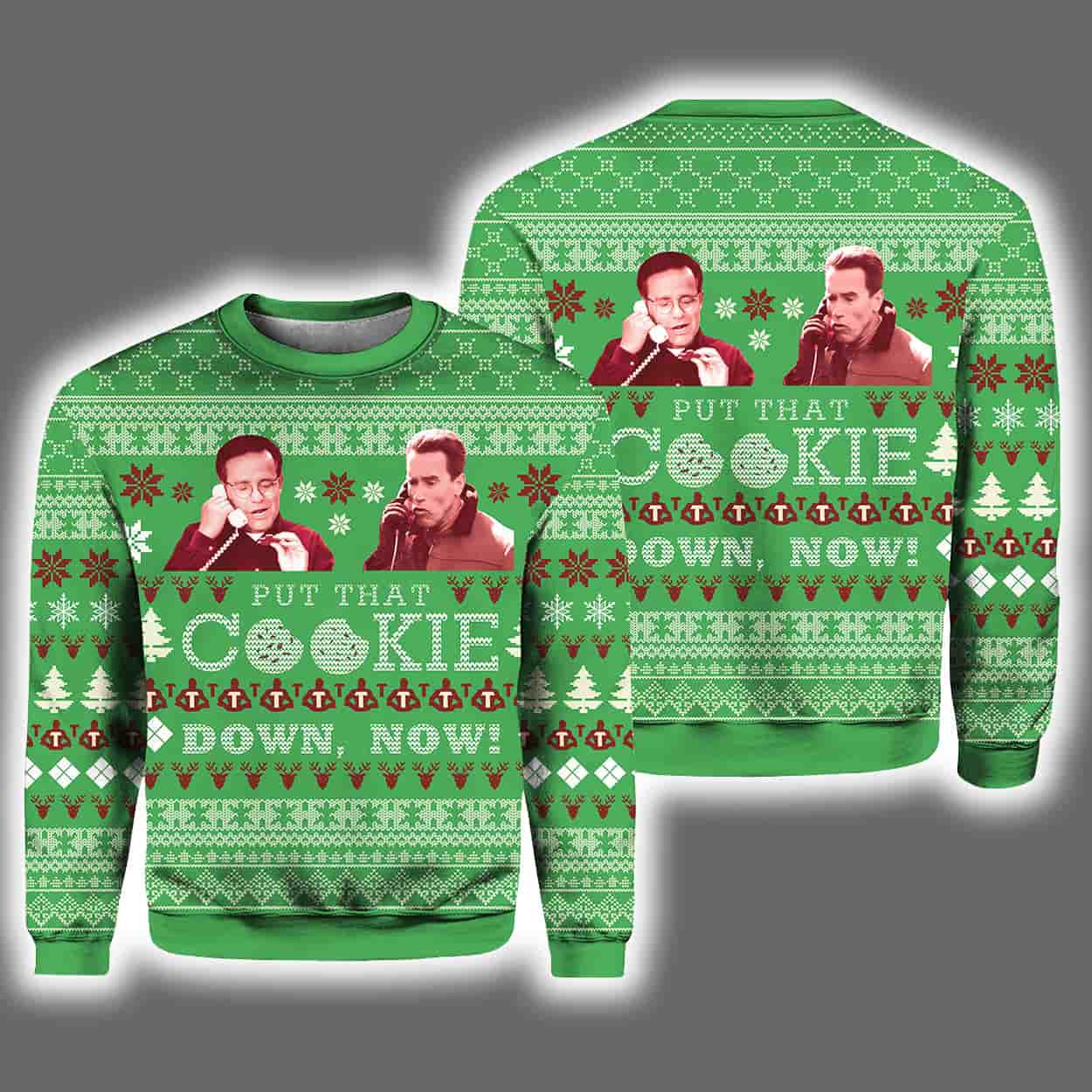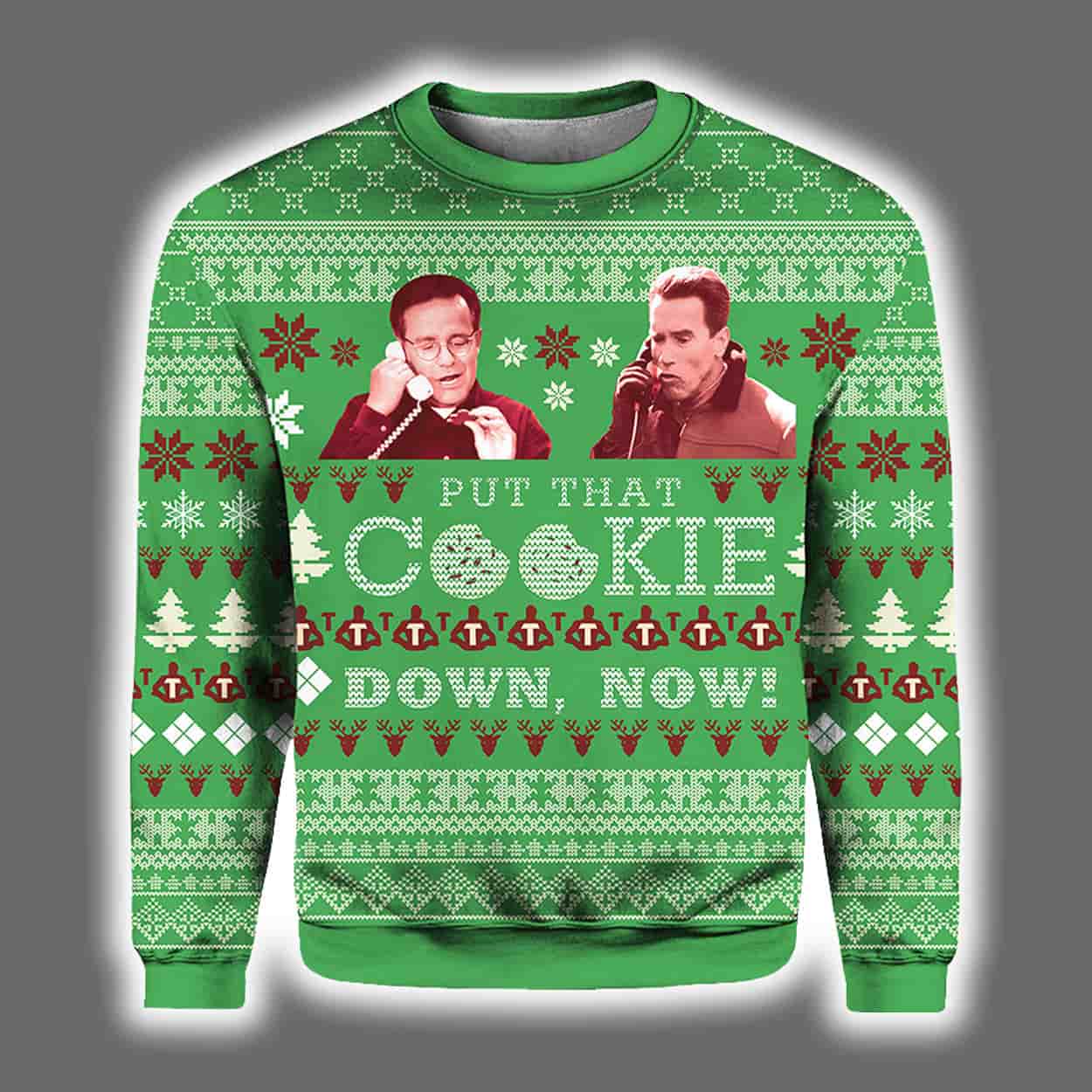 Get ready to sleigh the holiday party with the ultimate throwback: the Jingle All The Way Put That Cookie Down Now Christmas Ugly Sweater. A hilarious nod to Arnold Schwarzenegger’s iconic line from Jingle All the Way, this festive gem is perfect for fans of 90s movies and bold holiday humor.